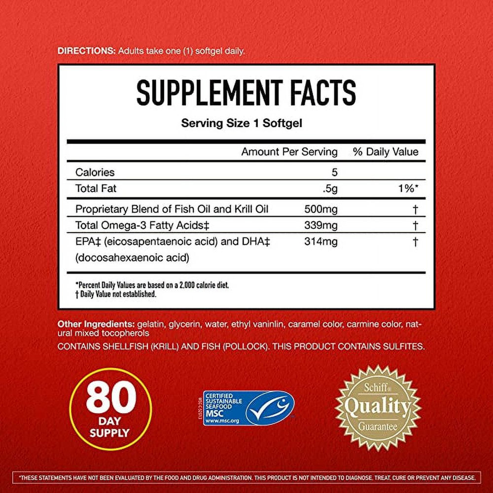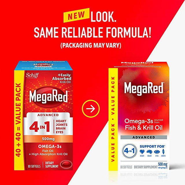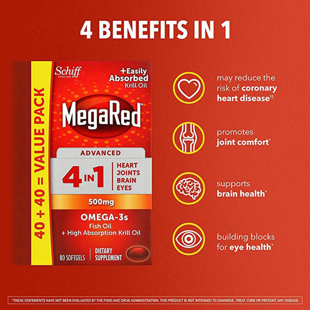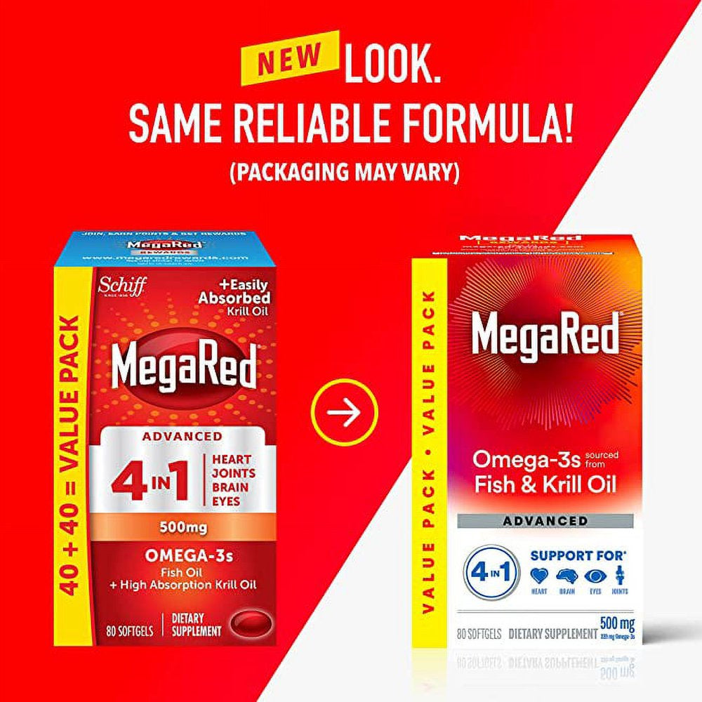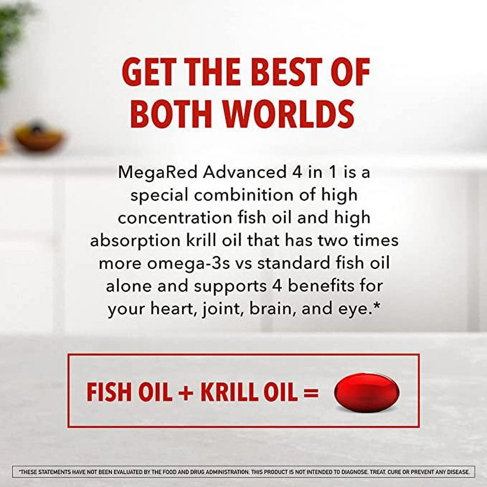 - FISH and KRILL OIL, BETTER TOGETHER: MegaRed Advanced 4-in-1 uses a special combination of high concentration fish oil and high absorption krill oil that has 2X more Omega 3s vs standard fish oil alone, and it supports heart, joint, brain, and eye health.