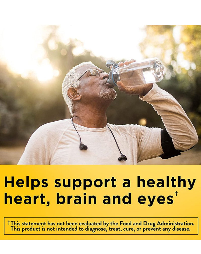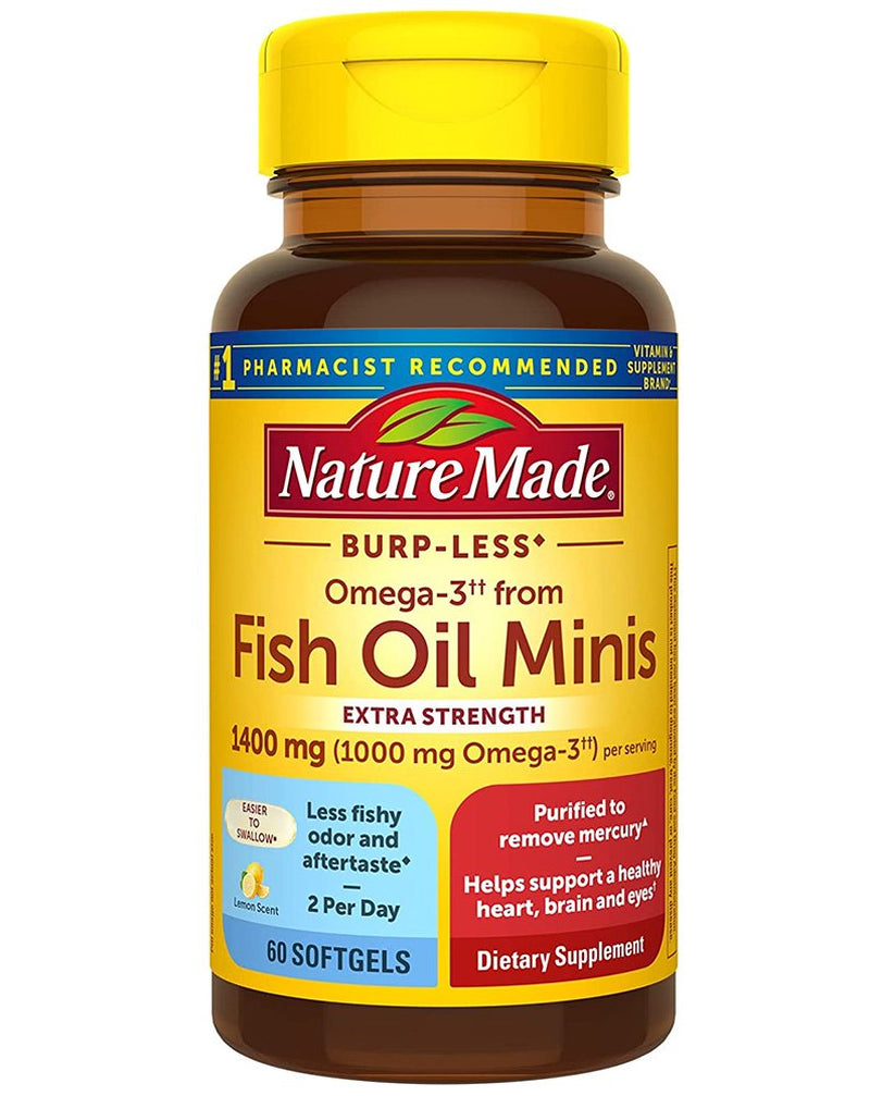 - Brain, Eye and Heart supplement: contains one 60 count bottle of Nature Made Extra Strength Burp Less Omega-3 (1) from Fish Oil 1400 mg per serving Minis Softgels for a 30-day supply