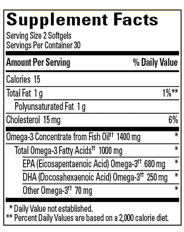 - One serving of two Omega 3 Fish Oil mini softgels (1) provides 680 mg of EPA and 250 mg of DHA to support a healthy heart, brain and eyes