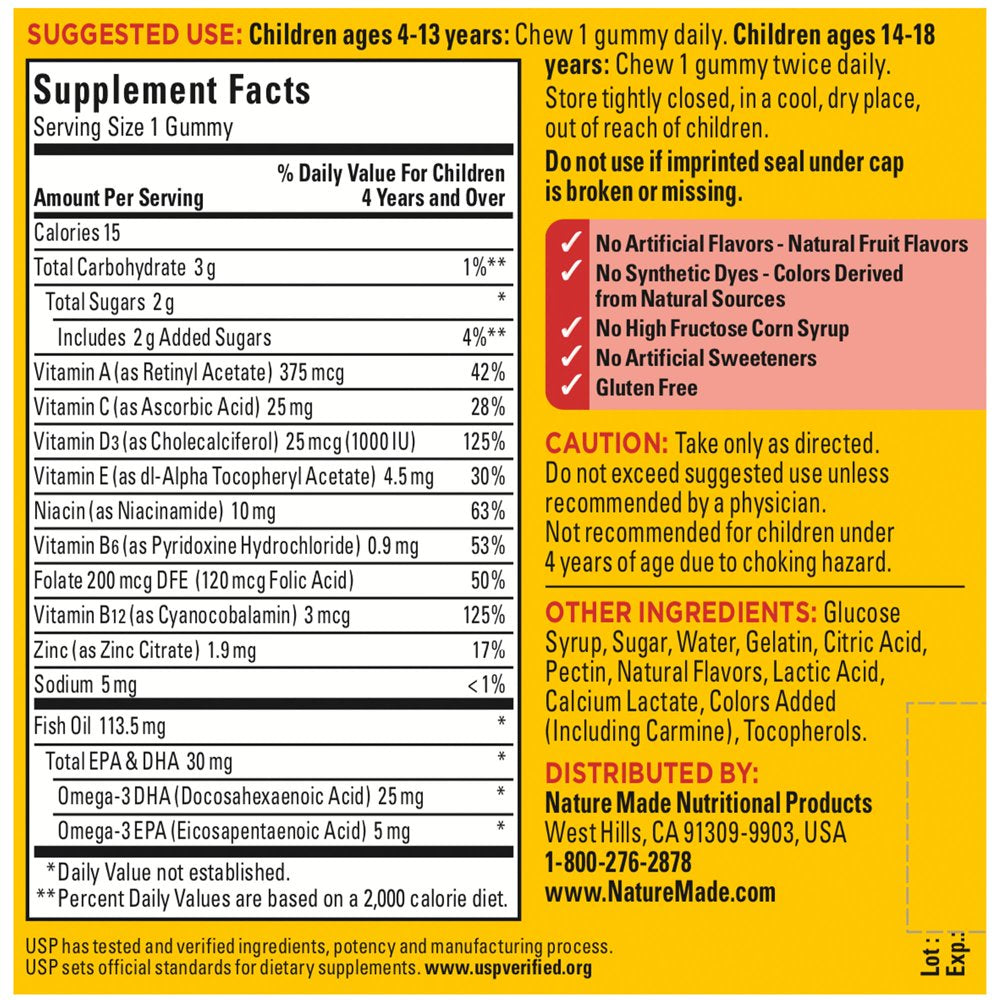 Nature Made - Kids First Multivitamin with Omega-3 Strawberry, Lemon and Orange - 70 Gummies Supplement Facts Serving Size: 1 gummie Servings Per Container: 70 Amount Per Serving % Daily Value Calories 15 Total Carbohydrate 2 g Sugars 2g Vitamin A(as Retinyl Acetate) 1250 IU 25% Vitamin C(as Sodium Ascorbate) 25 mg 42% Vitamin D3(as Cholecalciferol) 1000 IU 250% Vitamin E(as dl-Alpha Tocopheryl Acetate) 10 IU 33% Niacin(as Niacinamide) 10 mg 50% Vitamin B12(as Cyanocobalamin) 3 mcg 50% Zinc(as Zinc Sulfate) 1.9 mg 13% Sodium 10 mg <1% Fish Oil 113.5 mg Total EPA & DHA 30 mg Omega-3 DHA(Docosahexaenoic Acid) 25 mg Omega-3 EPA (Eicosapentaenoic Acid) 5 mg * Percent Daily Values are based on a 2,000 calorie diet. Your daily values may be higher or lower depending on your calorie needs. Other Ingredients: Sugar, corn syrup, water, gelatin, citric acid, lactic acid, calcium lactate, natural flavors, corn starch, malic acid, colors added (including carmine), tocopherols./div>
