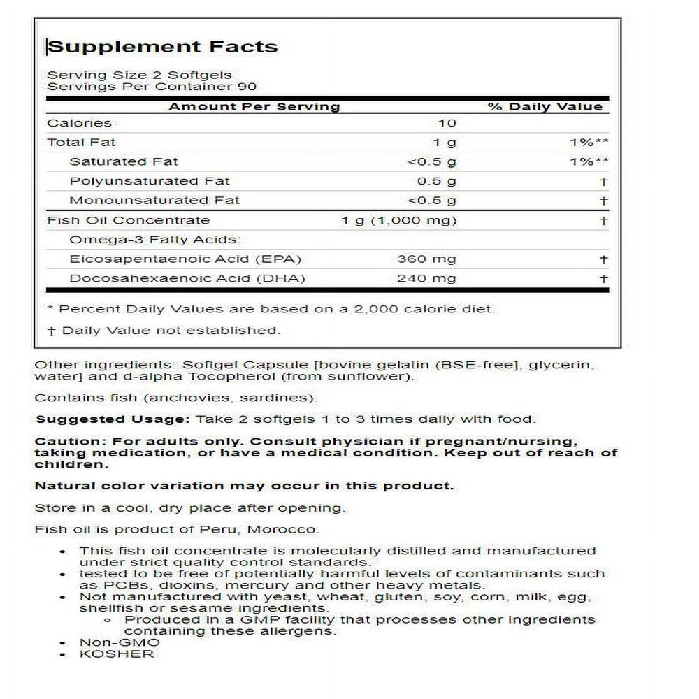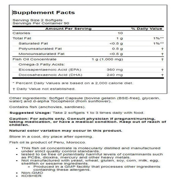 Omega-3 Mini Gels Fish Oil from Now offers 180 mg EPA and 120 mg DHA in small, easy-to-swallow softgels. This unique formula helps support cardiovascular health. The natural fish oil concentrate used in this softgel is manufactured under strict quality-control standards. It is tested to be free of potentially harmful levels of contaminants (i.e. mercury, heavy metals, PCBs, dioxins and other contaminants).