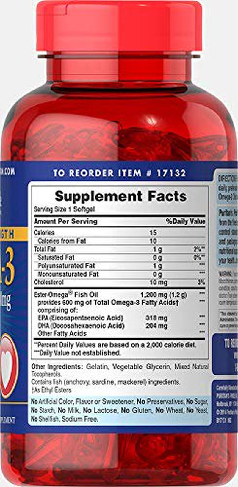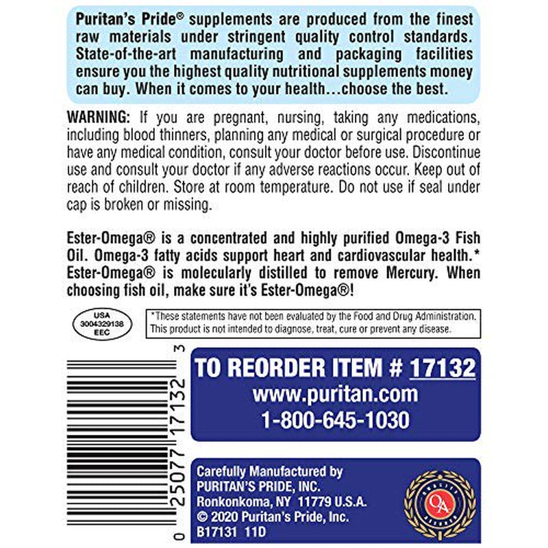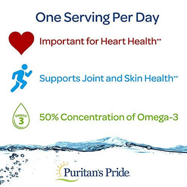 Fats are an important part of a healthy diet and essential to our body, but not all fats are created equal. There are bad fats, which include trans fats that are found in foods like french fries and donuts. And then there are good fats, such as Omega-3s. Omega-3 Fatty Acids are in fish such as salmon, anchovies and trout. Omega-3 Fatty Acids benefit your body from head to toe, supporting the health of your heart, joints and skin.** Omega-3s role in heart health is particularly noteworthy.** The National Institutes of Health recognizes that Omega-3 from fish oil can be beneficial for several cardiovascular measures.** Supportive but not conclusive research shows that consumption of EPA and DHA Omega-3 Fatty Acids may reduce the risk of coronary heart disease.** They also help maintain triglyceride levels that are already within a normal range.** The American Heart Association recommends at least two servings of oily fish per week, but Omega-3 Fatty Acids are often in short supply in our diets. Puritans Pride Omega-3 can help supplement your diet. Plus, they are enteric coated, which means that the active ingredients bypass the stomach and are digested in the small intestine, minimizing any fishy aftertaste. They are also purified to eliminate mercury. So if youre looking to balance your diet with these good fats, Omega-3 supplements are an easy way to get some essential nutrients your body relies on.** Supports heart health and healthy circulation.** Supports healthy joints.** Plays a role in providing an energy source for the body.** Contains a three to six-month supply of softgels.