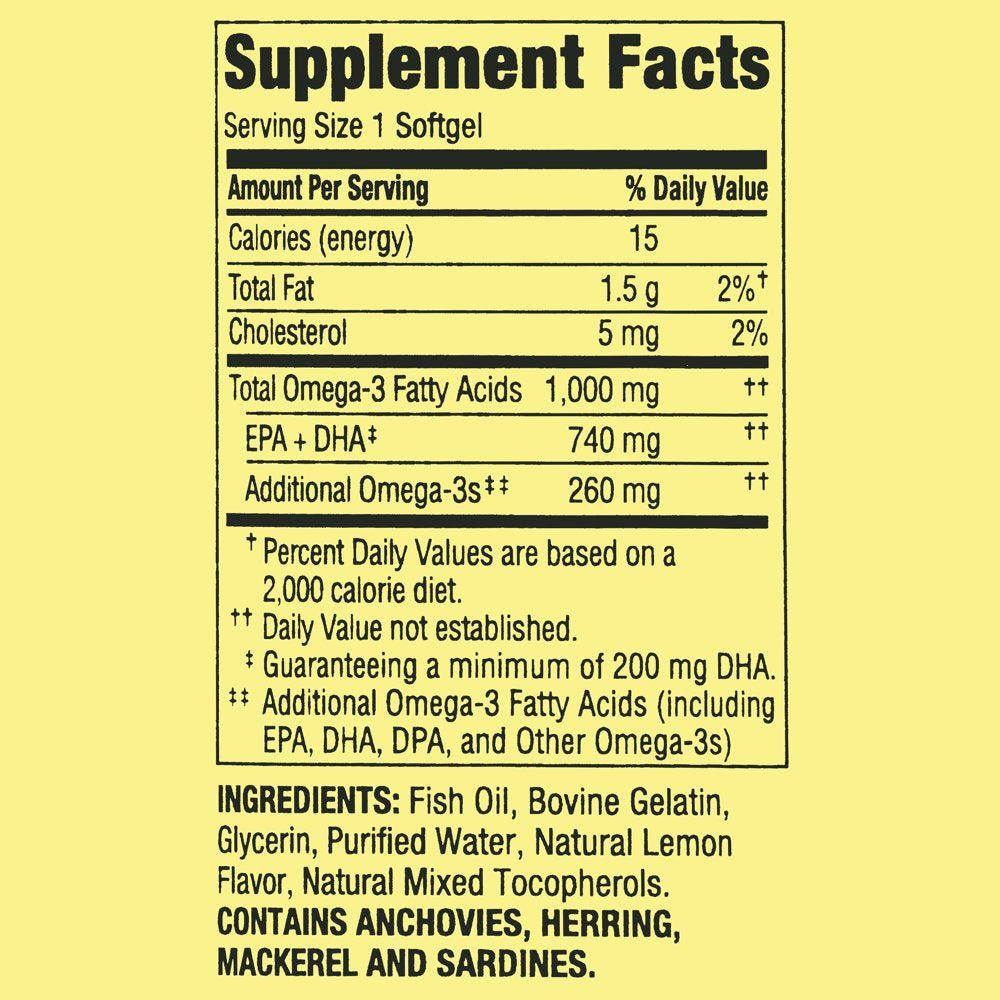 Spring Valley Proactive Support Omega-3 from Fish Oil Heart General and Brain Health Dietary Supplement Softgels are dietary supplements that promote heart, immune, and bone health*. The consumption of Omega-3 fatty acids may reduce the risk of coronary heart disease.* This unique blend of essential fatty acids for daily health and beauty contains 1,000 milligrams of Omega-3 fatty acids in every serving. They have a natural lemon flavor and contain no gluten, dairy, sweeteners, artificial colors, or artificial flavors. The suggested adult dosage is one softgel, three times daily, preferably with a meal. You can rest assured that Spring Valley Proactive Support Omega-3 from Fish Oil Heart General and Brain Health Dietary Supplement Softgels are produced with strict quality guidelines and are backed by our quality guarantee.