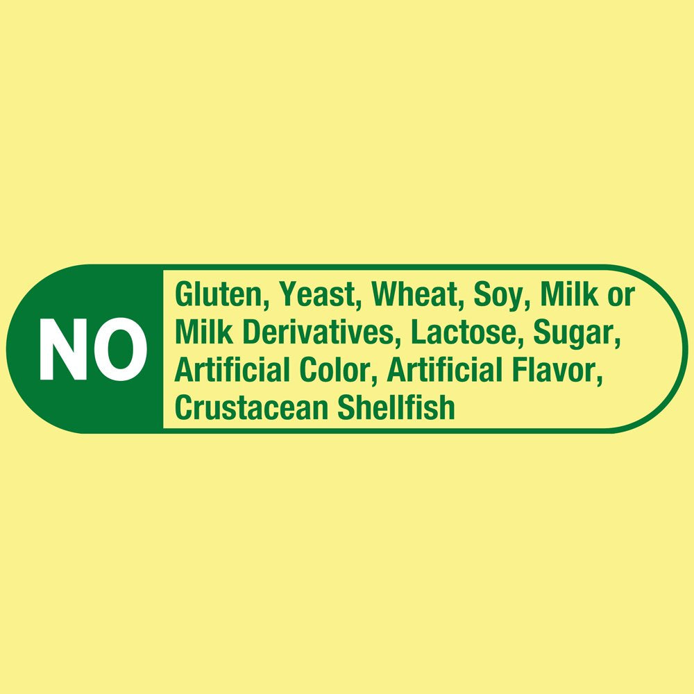- No gluten, yeast, wheat, soy, milk, lactose, crustacean shellfish, or sugar
