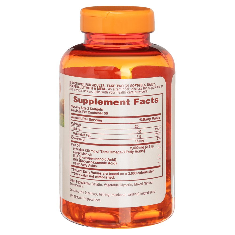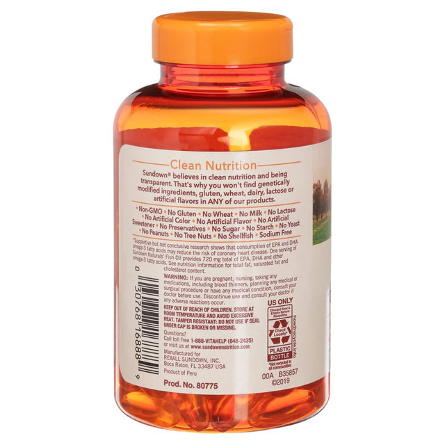 - Pack of 2 for the UPC: 030768168889 Dedicated to your good health.Dietary SupplementSundown VitActive Ingredients:2 Softgels: Calories 25 (Calories From Fat 20); Total Fat 2.5 g (Saturated Fat 0.5 g, Polyunsaturated Fat 1 g, Monounsaturated Fat 0.5 g); Cholesterol < 5 mg; Protein < 1 g; Fish Oil 2400 mg (2.4 g) (EPA [Eicosapentaenoic Acid], DHA [Docosahexaenoic Acid], Total Omega-3 Fatty Acids 720 mg); Gelatin; Vegetable Glycerin; Mixed TocopherolsFOR ADULTS, TAKE TWO (2) SOFTGELS ONE TO TWO TIMES DAILY, PREFERABLY WITH A MEAL. As a reminder, discuss the supplements and medications you take with your health care providers. Uses:Omega-3 fatty acids are 'good fats' which help to balance the 'bad fats' in your diet. By helping to balance the bad fats in your diet, Omega-3s such as EPA and DHA play an important role in supporting the immune system, as well as helping to maintain circulatory and metabolic health.* Supportive but not conclusive research shows that consumption of EPA and DHA omega-3 fatty acids may reduce the risk of coronary heart disease. See nutrition information for total fat, saturated fat and cholesterol content. Mercury free. No artificial color, flavor or sweetener. No preservatives, no sugar, no starch, no milk, no lactose, no gluten, no wheat, no yeast, no shellfish. Sodium free. Contains fish (anchovy, mackerel, sardine) ingredients. If you are pregnant, nursing, taking any medications, or planning any medical procedure, consult your doctor before use. Discontinue use and consult your doctor if any adverse reactions occur. KEEP OUT OF REACH OF CHILDREN. STORE IN A DRY PLACE AND AVOID EXCESSIVE HEAT. TAMPER RESISTANT: DO NOT USE IF SEAL UNDER CAP IS BROKEN OR MISSING. *This product is not intended to diagnose, treat, cure or prevent any disease.