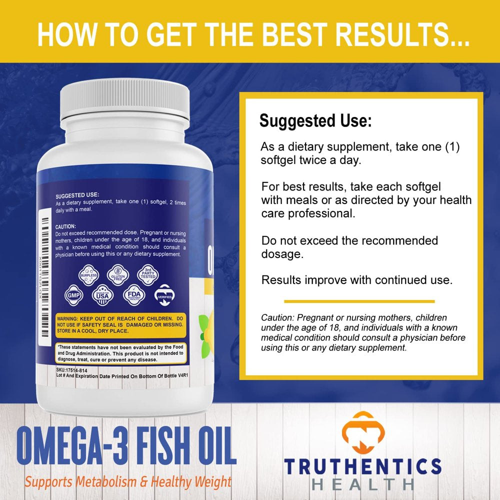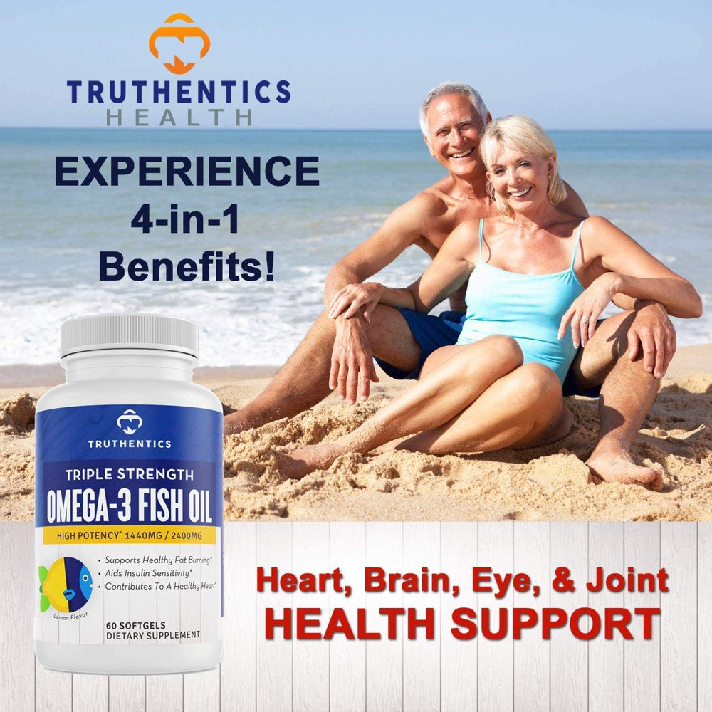 • RICH IN OMEGA-3 FATTY ACIDS EPA & DHA - Each daily serving of Truthentics Omega-3 Fish Oil is rich in fatty acids and contains 1440 Omega 3 Fatty Acids (864mg of EPA, 576mg of DHA) and is concentrated in true natural Triglyceride form for enhanced absorption and superior bioavailability.*