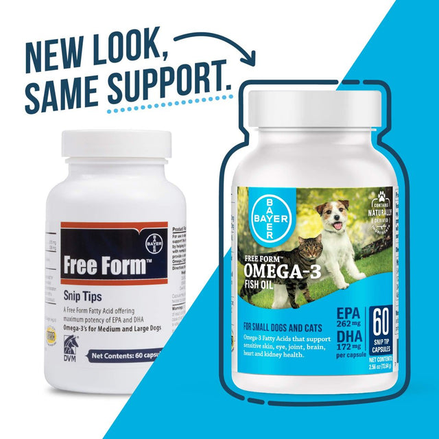 Size:Small Dogs/Cats, 60 count Bayer Free Form Snip Tips Omega-3 Fish Oilcontains 60 highly-concentrated, liquid-filled capsules of omega-3 fatty acidsfor cats and small dogs. Each capsule contains beneficial omega-3 fatty acidsformulated for easy absorption and higher concentrations of EPA and DHA thanfound in some other fish oil products. Help support your dog or cat'ssensitive skin, eye, joint, brain, heart and kidney health with Free Form.Flexible dosing means you can administer the supplement in the way that worksbest for your pet. Either give the capsule whole or snip or twist off the tipfor easy administration. The oil in Free Form is harvested from anchovies, arenewable fish source, and tested for heavy metals, bacteria and fungi. Bayeris proud to display the National Animal Supplement Council (NASC) QualitySeal, on all of our supplements. The NASC monitors animal health supplementsthrough periodic reviews, inspections and testing. As a pet owner, you canfeel confident that every supplement batch is made following procedures toverify that it meets quality control specifications and is labeled withaccuracy and consistency.