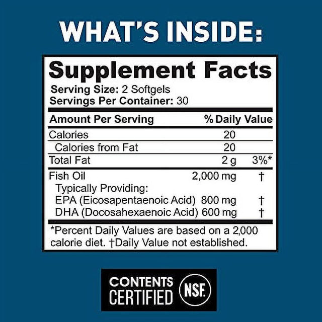 - 2,000 milligrams of fish oil delivers 1,400 milligrams of Omega-3 fatty acids per serving