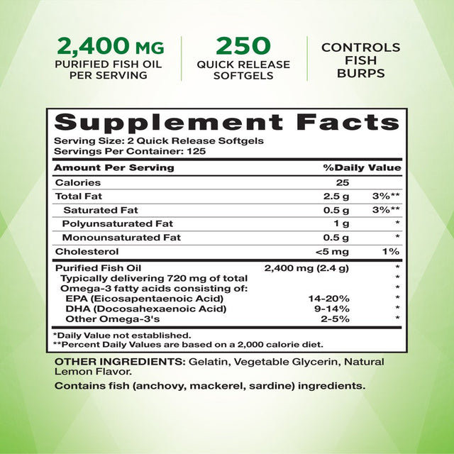 Fish Oil Omega 3 | 2400 Mg | 250 Liquid Softgels | Burpless Lemon Flavor Pills | Non-Gmo, Gluten Free Supplement | by Nature'S Truth