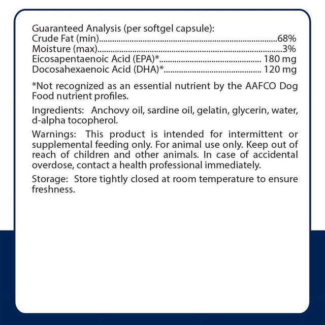 Healthy Breeds Omega-3 Fish Oil Softgels are derived from wild anchovy and sardines. Important omega-3 fatty acids, EPA and DHA, help support healthy skin, coat, joints, heart, immune system and the development and maintenance of the brain and eyes. Daily supplementation with Healthy Breeds Omega-3 Fish Oil Softgels is a proactive way to help maintain overall health for your dog.