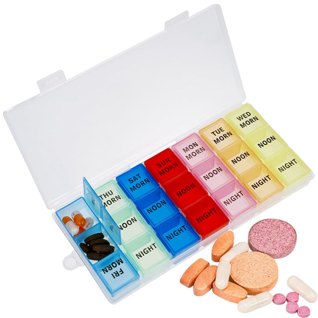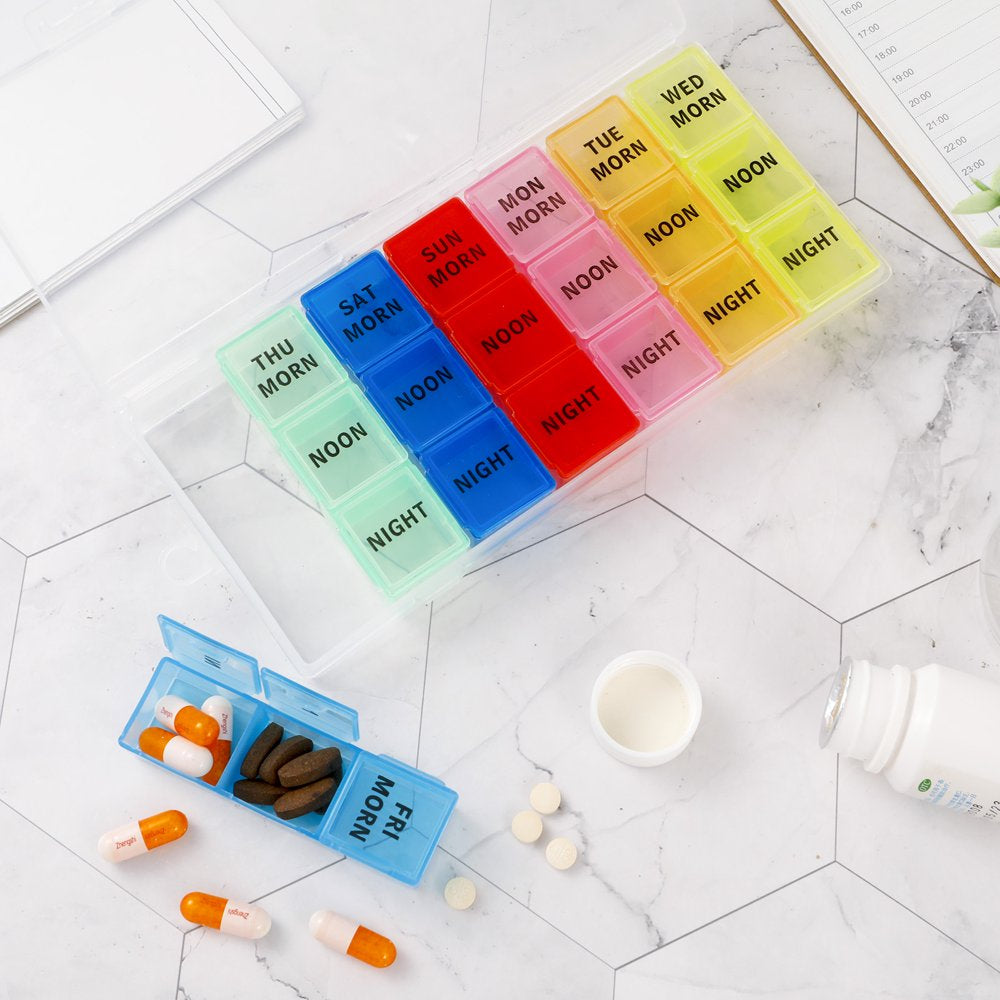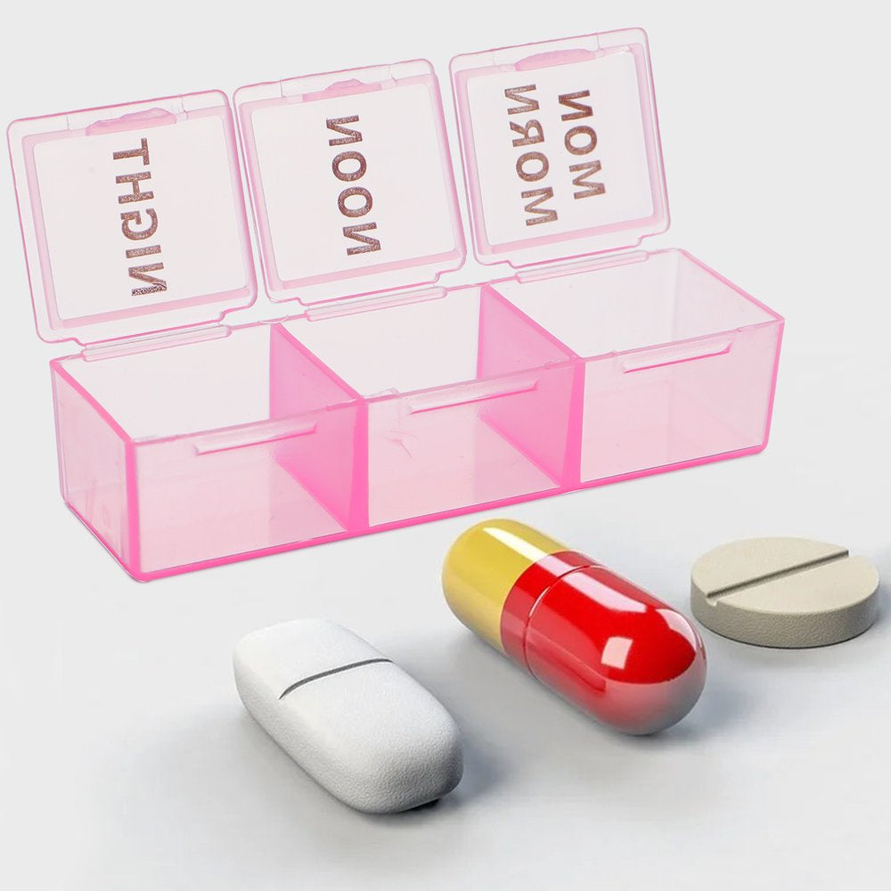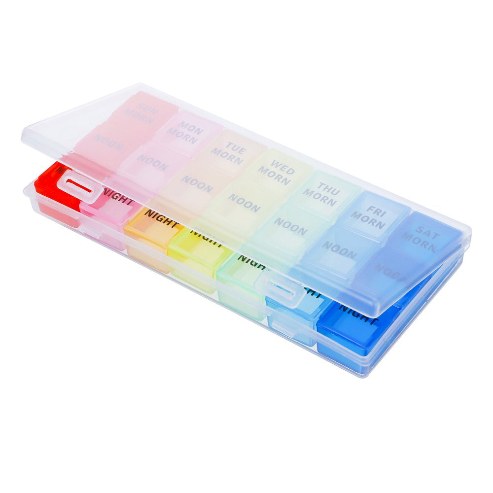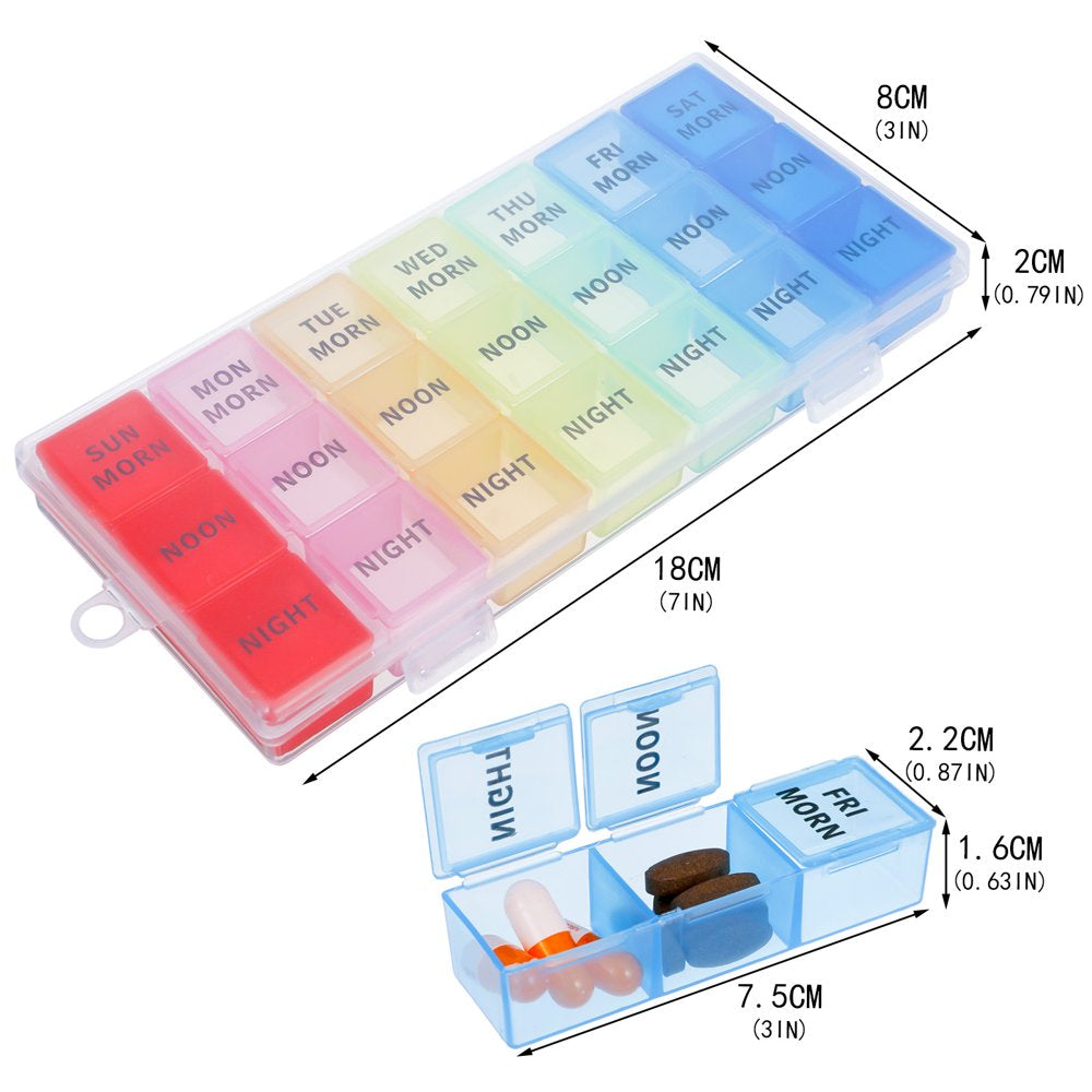 - Size and Packing: The overall size of the weekly pill box is: 7 in x 3 in x 0.79 in and the size of a single small compartment is: 2.95 in x 0.87 in x 0.63 in. You can simply organize your weekly medication dispenser at the start of the week and place the organizer on the counter, ready to use when needed