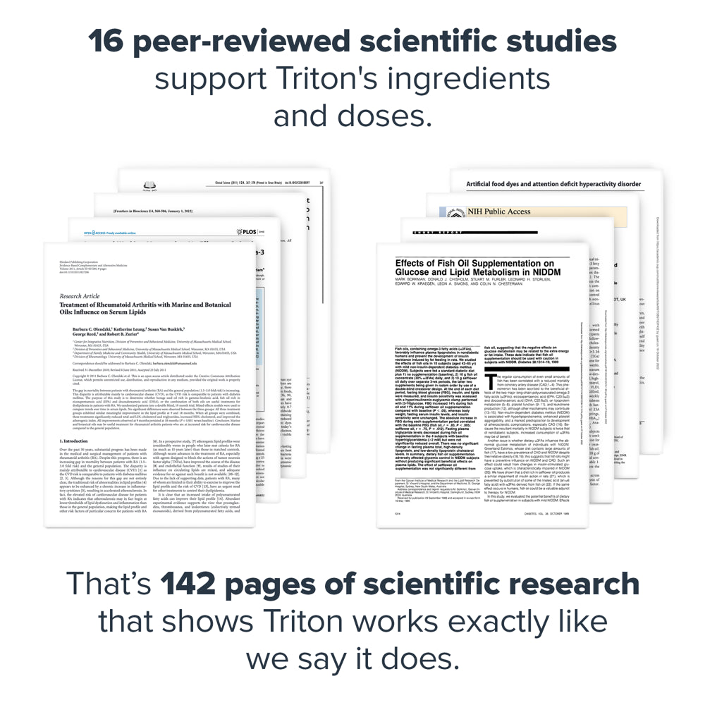 Triton is a 100% natural, high-potency, molecularly distilled fish oil with added vitamin E and lemon oil to prevent oxidation, rancidity, and “fish oil burps.”