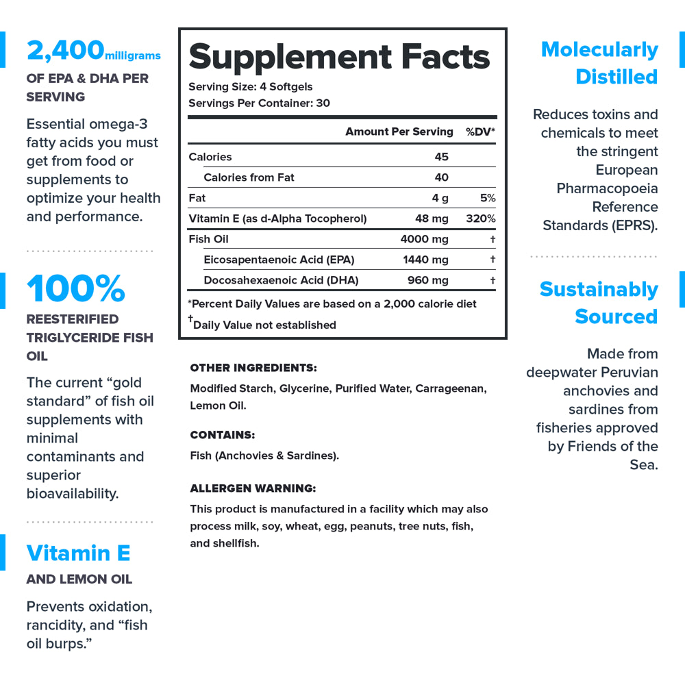 - HIGH-POTENCY BURPLESS FISH OIL PILLS. Triton provides 2,400 milligrams of highly bioavailable EPA DHA omega 3 fatty acids in every serving, as well as added vitamin E and lemon oil to prevent oxidation, rancidity, and “fish oil burps.” 120 Count Softgels.