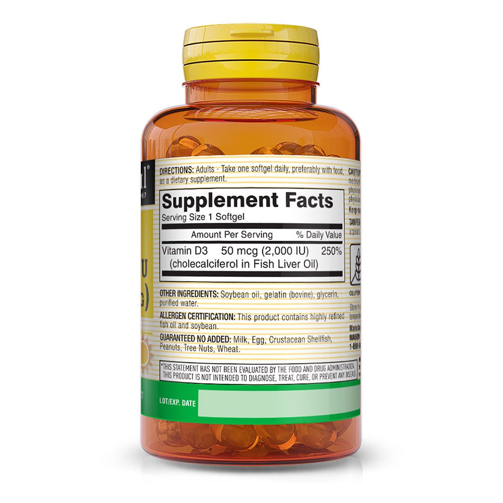 Mason Natural Vitamin D3 50 Mcg (2000 IU) - Supports Overall Health, Strengthens Bones and Muscles, from Fish Liver Oil, 60 Softgels