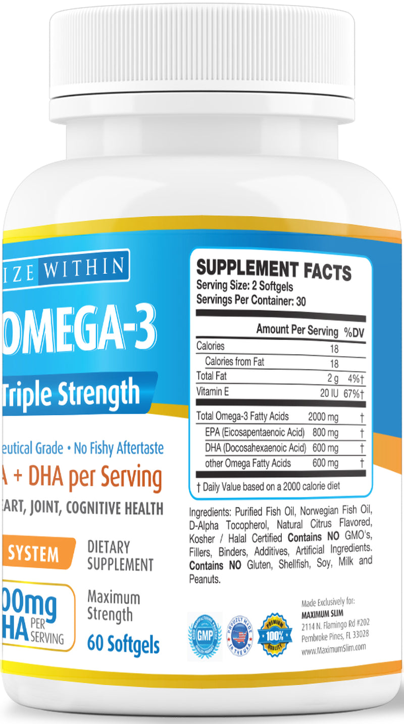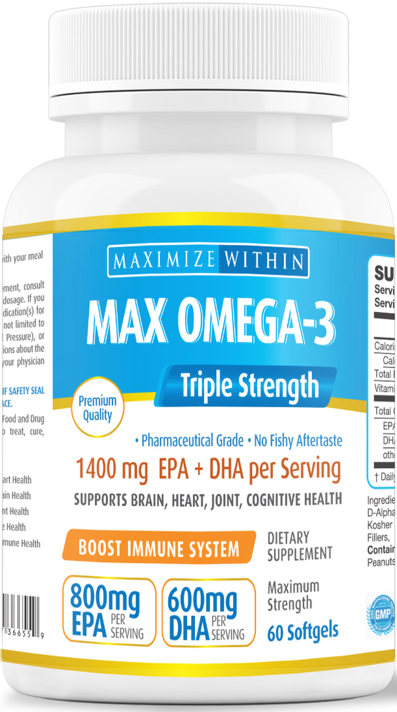 Let The Quality Of Your Omega 3 show in your overall brain, heart, join and cognitive health. Max Omega -3 Fish Oil contains a rich source of Omega-3 fatty acids, which have been known in the medical field to provide numerous health benefits. It supports the strength of your heart health, Promotes a healthy heart and cardiovascular system. Strengthens the immune system for ultimate wellness. Natural energy booster and mood enhancer. Just one dose provides you with you 2000 mg fish oil with 1400mg Omega 3 (800mg EPA, 600mg DHA), without the fishy aftertaste.