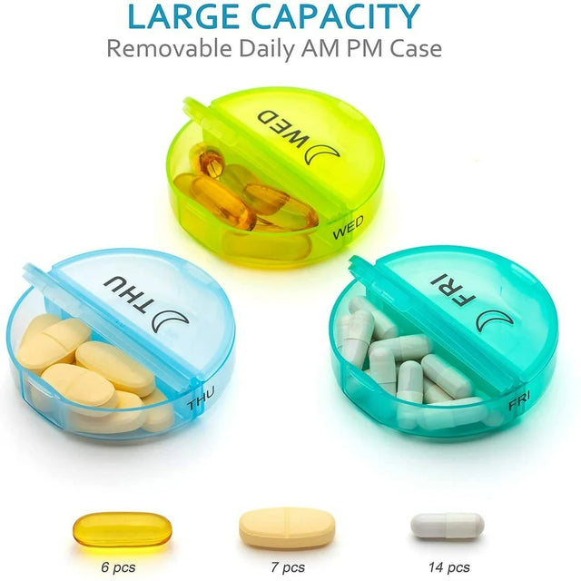 - ãREMOVABLE CASE AND LARGE CAPACITYãThe one month pill box organizer is compact but with enough capacity to store up to 6 fish oils/7 vitamins/14 capsules.The removable daily AM PM case that can pop out of the organizer to travel with you in your purse, bag, etc.Small and lightweight, ideal for tracking daily medicine. Never miss your daily medication regimen again.