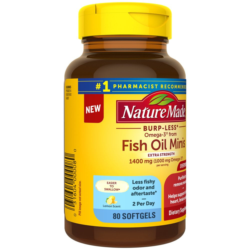 - Brain, Eye and Heart supplement: contains one 80 count bottle of Nature Made Extra Strength Burp Less Omega-3 (1) from Fish Oil 1400 mg per serving Minis Softgels for a 40-day supply