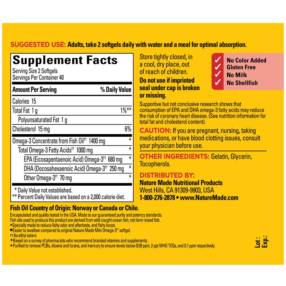 Nature Made Extra Strength Burp Less (3) Omega-3 (1) from Fish Oil 1400 mg Minis Softgels, lemon scent, are dietary supplements formulated to help support a healthy heart, brain and eyes. A serving of two mini softgels provides 1400 mg Omega-3 (1) concentrate from Fish Oil with 1000 mg Omega 3 fatty acids (EPA - 680 mg, DHA - 250 mg). Sourced from high quality ingredients, this Nature Made Omega 3 Fish Oil supplement is a gluten free Omega 3 supplement that has no color added, no milk and no shellfish. These Nature Made Omega-3 (1) from Fish Oil supplements are also easier to swallow (4). For those who don’t consume fish regularly, this Nature Made Omega 3 fish oil supplement (1) can help provide Omega-3s. Adults, take two softgels daily with water and a meal for optimal absorption. Supportive but not conclusive research shows that consumption of EPA and DHA Omega-3 fatty acids may reduce the risk of coronary heart disease. (See nutrition information for total fat and cholesterol content). Nature Made Fish Oil Omega 3 supplements (1) are quality you can trust. (1)As ethyl esters. (2)Purified to remove PCBs, dioxins and furans, and mercury to ensure levels below 0.09 ppm, 2 ppt WHO TEQs, and 0.1 ppm respectively. (3)Specially made to reduce fishy odor and aftertaste, and fishy burps (4)Easier to swallow compared to original Nature Made Mini Omega 3 (1) softgel *Based on a 2022 survey of pharmacists who recommend branded vitamins and supplements.CAUTION: If you are pregnant, nursing, taking medications, or have blood clotting issues, consult your physician before use.