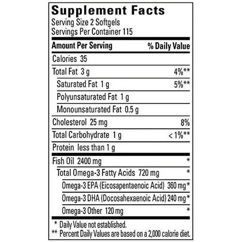 - One serving of two fish oil softgels provides 720 mg Omega-3 fatty acids (600 mg EPA and DHA) to help support a healthy heart