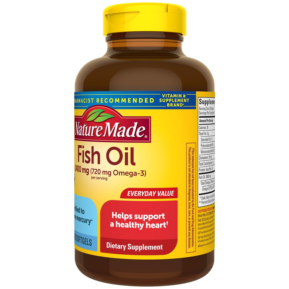 Nature Made Fish Oil 2400 mg is a dietary supplement that provides 720 mg Omega-3 fatty acids per serving to help support a healthy heart. A serving of two Nature Made Omega 3 Fish Oil softgels provides 2400 mg Fish Oil with 720 mg Omega 3s (600 mg EPA and DHA). Sourced from high quality ingredients, these gluten free Nature Made Fish Oil 2400 mg per serving softgels have no color added and no artificial flavors. These Fish Oil supplements for women and men are purified to remove mercury (2) from wild-caught ocean fish, not farm-raised fish. Adults, take two of these Omega 3 Fish Oil softgels daily with water and a meal. For those who don’t consume fish regularly, an Omega 3 supplement like fish oil Nature Made can help provide Omega 3 Fish Oil for men and women. Supportive but not conclusive research shows that consumption of EPA and DHA Omega-3 fatty acids may reduce the risk of coronary heart disease. (See nutrition information for total fat and cholesterol content). Nature Made Omega 3 supplements are quality you can trust. (2)Purified to remove PCBs, dioxins and furans, and mercury to ensure levels below 0.09 ppm, 2 ppt WHO TEQs, and 0.1 ppm respectively. *Based on a 2022 survey of pharmacists who recommend branded vitamins and supplements.CAUTION: If you are pregnant, nursing, taking medications, or have blood clotting issues, consult your physician before use.