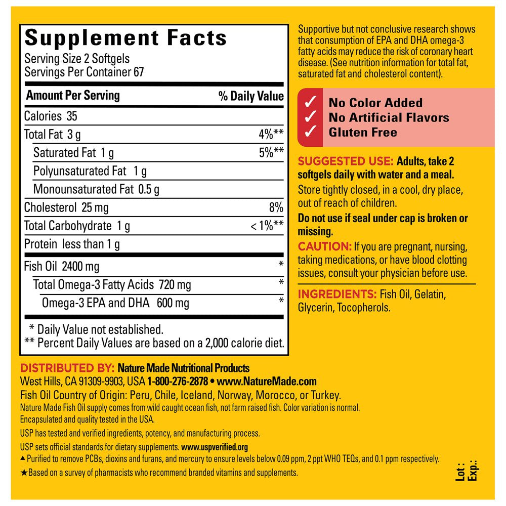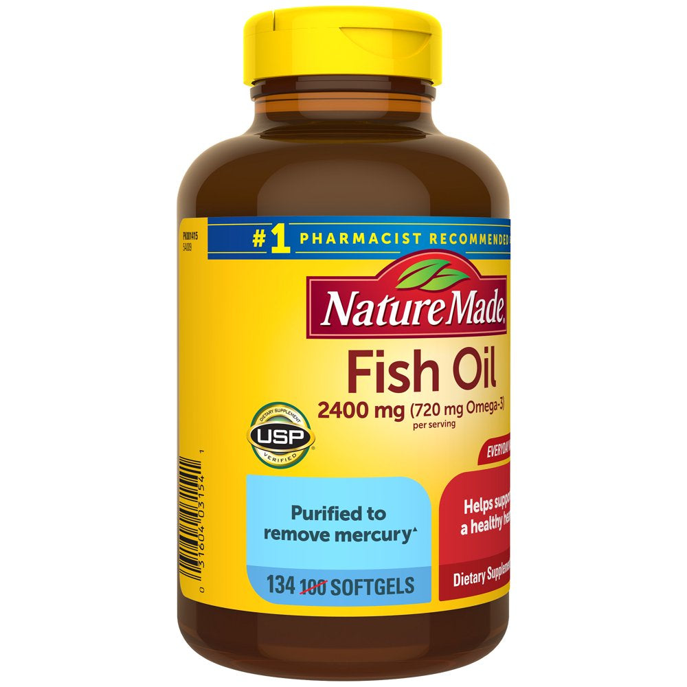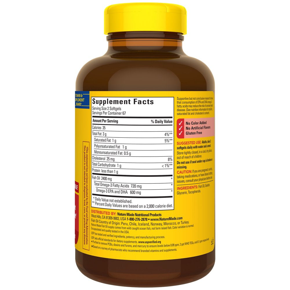 - Heart health support supplement: contains one 134 count bottle of Nature Made Fish Oil 2400 mg per serving Softgels for a 67-day supply