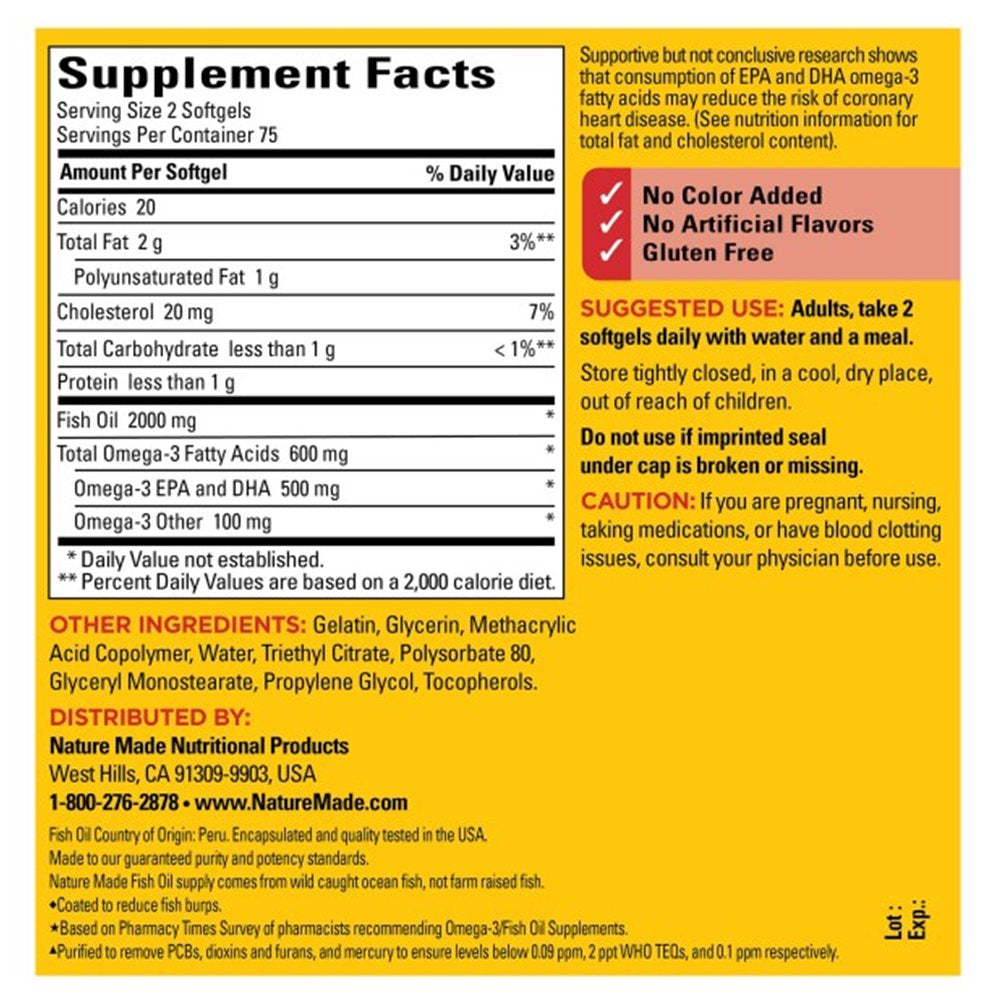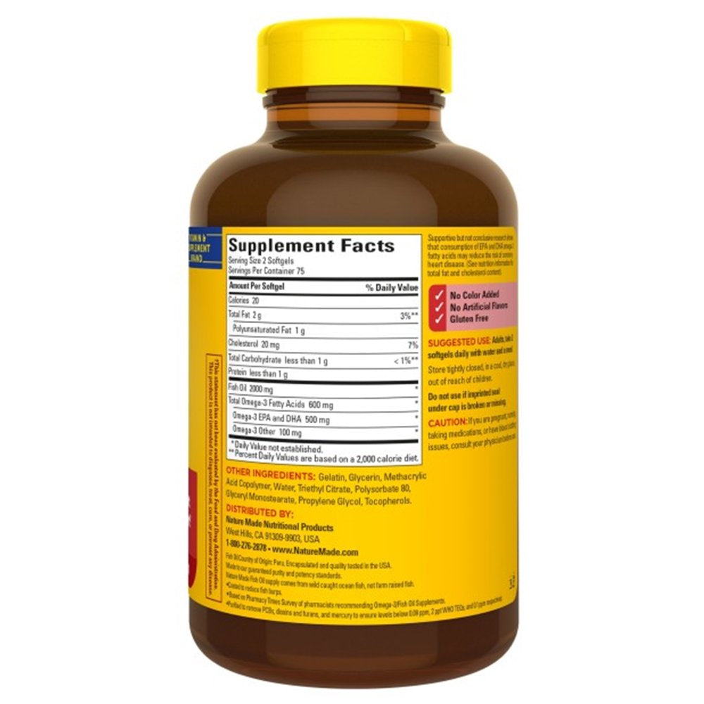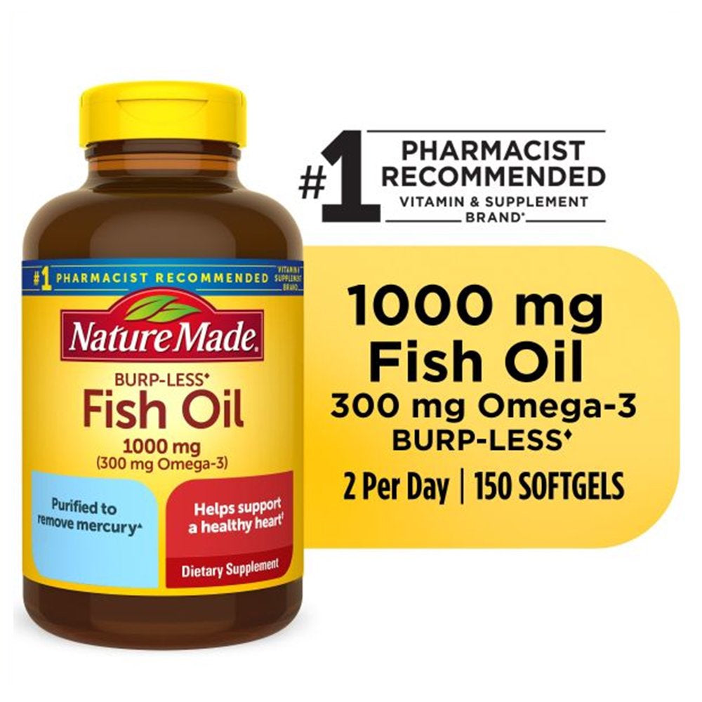 - Heart health support supplement: contains one 150 count bottle of Nature Made Burp Less (3) Fish Oil 1000 mg Softgels with 300 mg Omega-3 fatty acids, for a 75-day supply