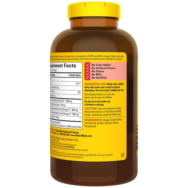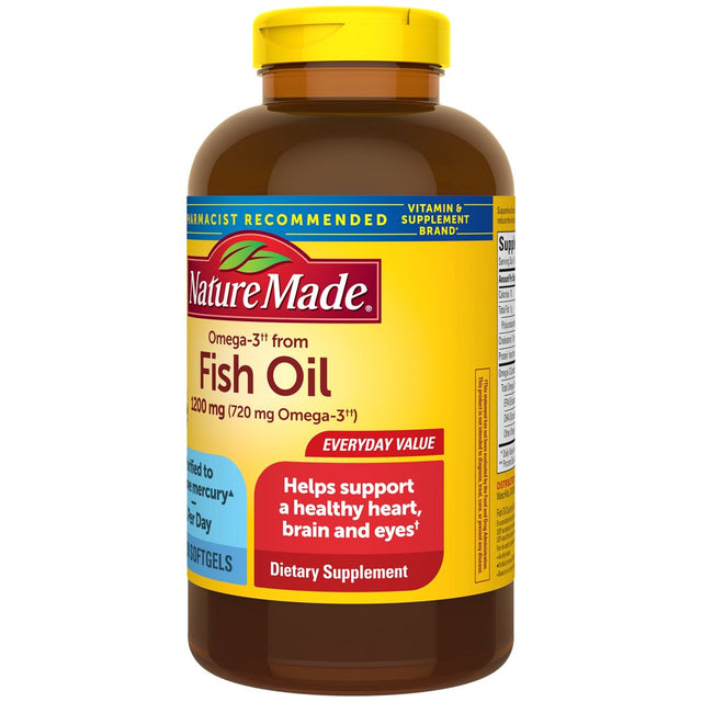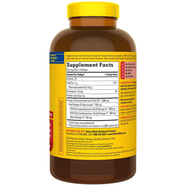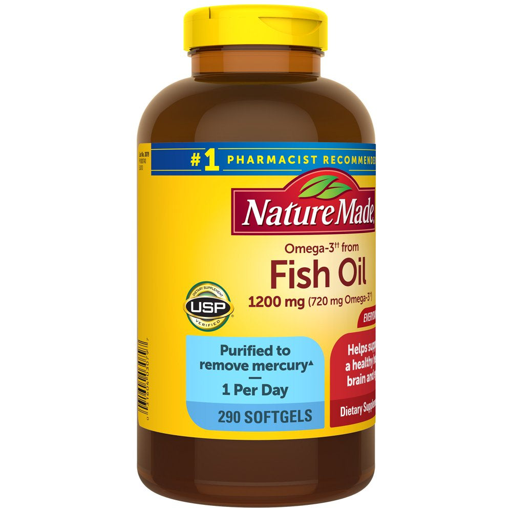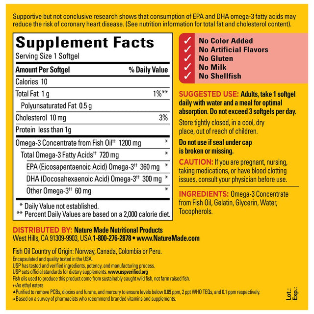 Nature Made Omega-3 (1) from Fish Oil 1200 mg Softgels are dietary supplements formulated to help support a healthy heart, brain and eyes. Sourced from high quality ingredients, this Nature Made Omega 3 Fish Oil for men and women (1) is a gluten free Omega 3 supplement that has no color added, no artificial flavors, no milk and no shellfish. Offering 1200mg Omega-3 (1) concentrate from Fish Oil (EPA - 360 mg, DHA - 300 mg) per softgel, these Nature Made Fish Oil supplements for women and men support heart, brain and eye health. For those who don’t consume fish regularly, a Fish Oil for women and men like this Nature Made Omega 3 fish oil supplement (1) can help provide Omega 3s. Adults, take one Nature Made Fish Oil 1200 mg (720mg Omega-3) softgel daily with water and a meal for optimal absorption. Supportive but not conclusive research shows that consumption of EPA and DHA Omega-3 fatty acids may reduce the risk of coronary heart disease. (See nutrition information for total fat and cholesterol content). Nature Made Fish Oil Omega 3 supplements are quality you can trust. USP has tested and verified ingredients, potency and manufacturing process. USP sets official standards for dietary supplements. Visit the USP verified website for more information. (1)As ethyl esters. (2)Purified to remove PCBs, dioxins and furans, and mercury to ensure levels below 0.09 ppm, 2 ppt WHO TEQs, and 0.1 ppm respectively. *Based on a 2022 survey of pharmacists who recommend branded vitamins and supplements.CAUTION: If you are pregnant, nursing, taking medications, or have blood clotting issues, consult your physician before use.