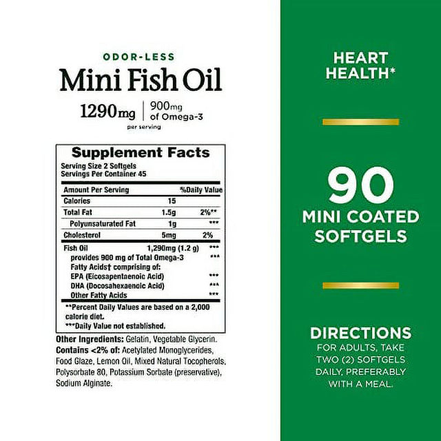 Nature’s Bounty Mini Fish Oil Softgels 1290 mg, Omega-3, Supports Heart Health, Odor-Less, 90 Mini Coated Softgels