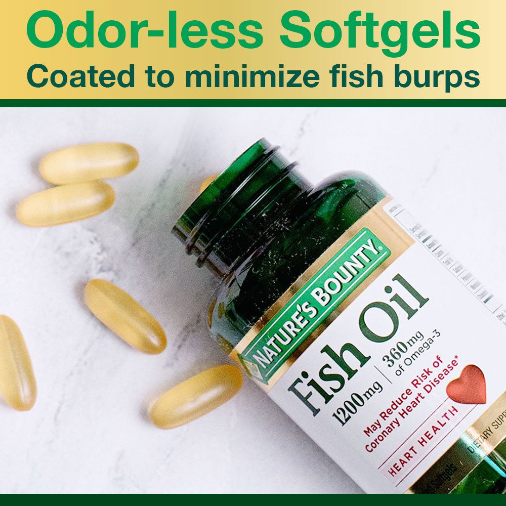 Nature's Bounty Fish Oil 1200 Fish Oil contains EPA and DHA which help support and maintain the health of your cardiovascular and circulatory system.* Omega-3 fatty acids are considered “good” fats and help maintain triglyceride levels already within a normal range.* Odorless Fish Oil is coated to minimize the aftertaste and fish burps!