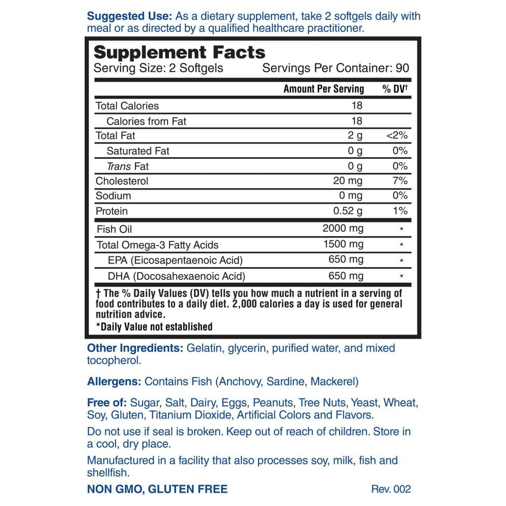 • 650 mg of EPA, and 650 mg of DHA in two softgels