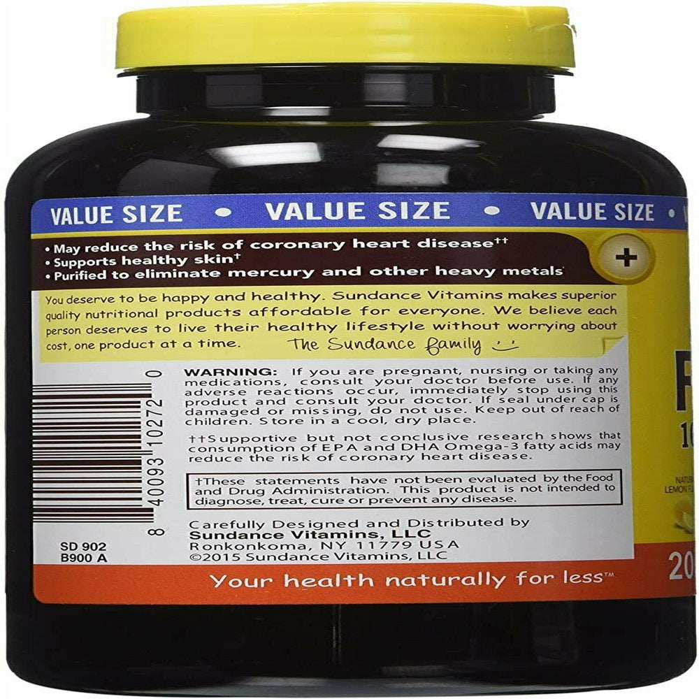 Heart health.* May reduce the risk of coronary heart disease.** Supports healthy skin.* Purified to eliminate mercury and other heavy metals. You deserve to be happy and healthy. Sundance Vitamins makes superior quality nutritional products affordable for everyone. We believe each person deserves to live their healthy lifestyle without worrying about cost, one product at a time. Controls fish burps. Gluten free. *These statements have not been evaluated by the Food and Drug Administration. This product is not intended to diagnose, treat, cure or prevent any disease. **Supportive but not conclusive research shows that consumption of EPA and DHA Omega-3 fatty acids may reduce the risk of coronary heart disease.