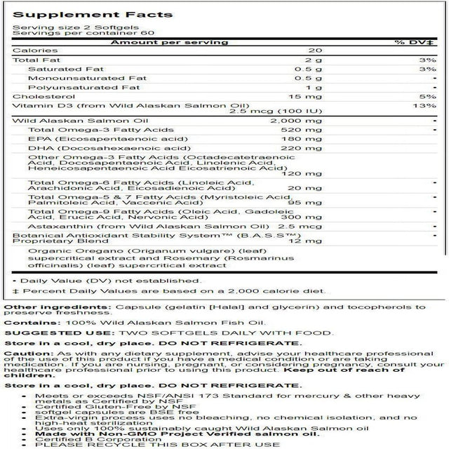 New Chapter(R) Wholemega(TM) Fish Oil delivers nature's whole complement of 17 omegas--from 3, 5, 6, 7 and 9s--along with vitamin D3 and antioxidants. Taking Wholemega every day for a week delivers 935 mg of highly absorbable good Omegas, the same amount of whole omega fatty acids as three servings of wild Alaskan salmon. The extra-virgin process usues no bleaching, no chemical isolation and no high-heat sterilization. Supports heart, brain, eye and joint health and overall wellness.