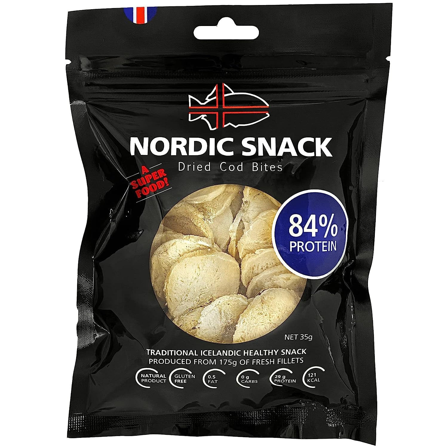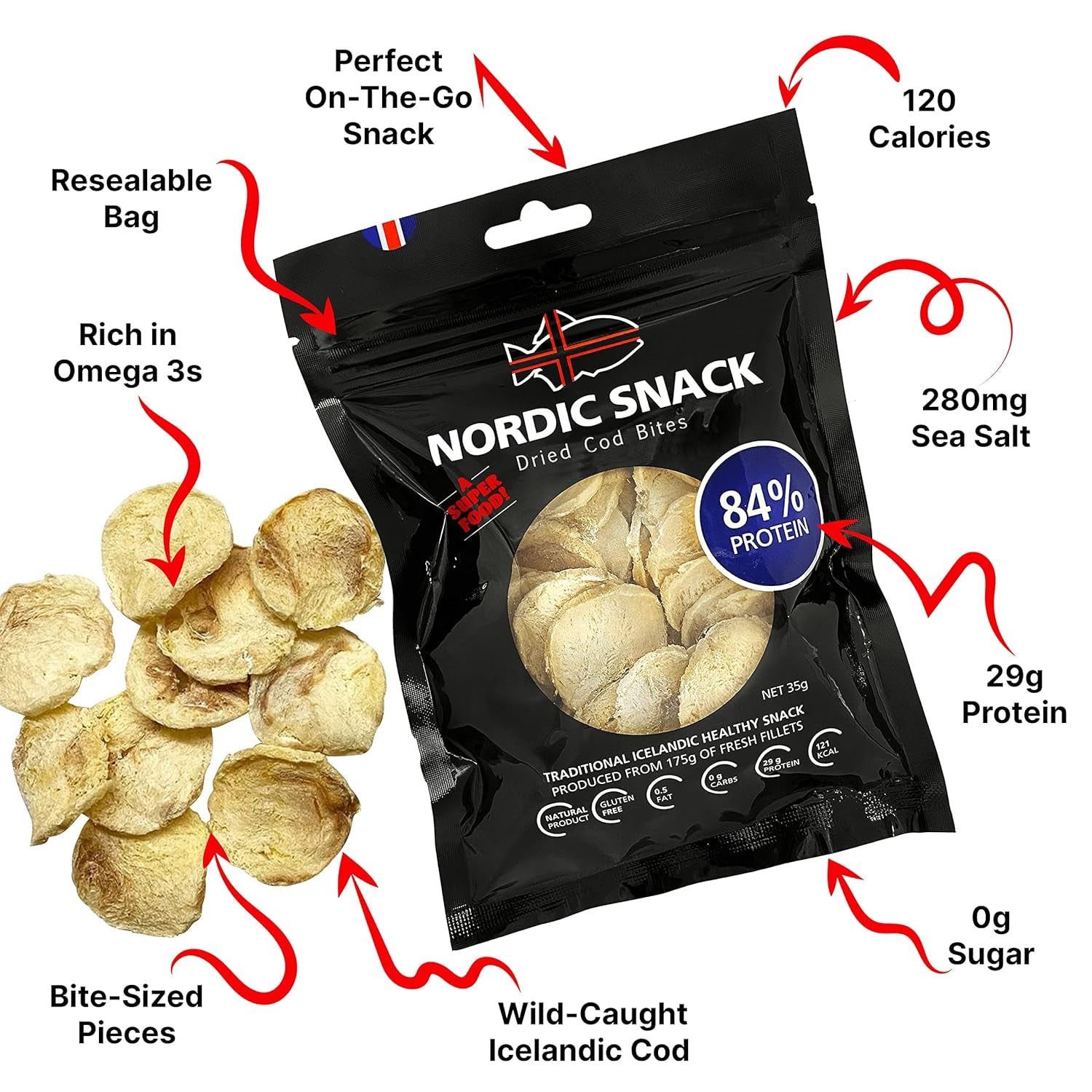 - DIET FRIENDLY SNACK: Our Freeze Dried Cod Bites are packed with 29 grams of protein, 120 calories and are rich in omega 3 fatty acids, making this seafood snack keto friendly! These fish bites are also free of gluten and sugar so people with gluten allergies or with diabetes can dive into the delicious flavors of Iceland. We use a little bit of sea salt to season these bites so they are also a low-sodium food and are a healthier option compared to other jerky and chips