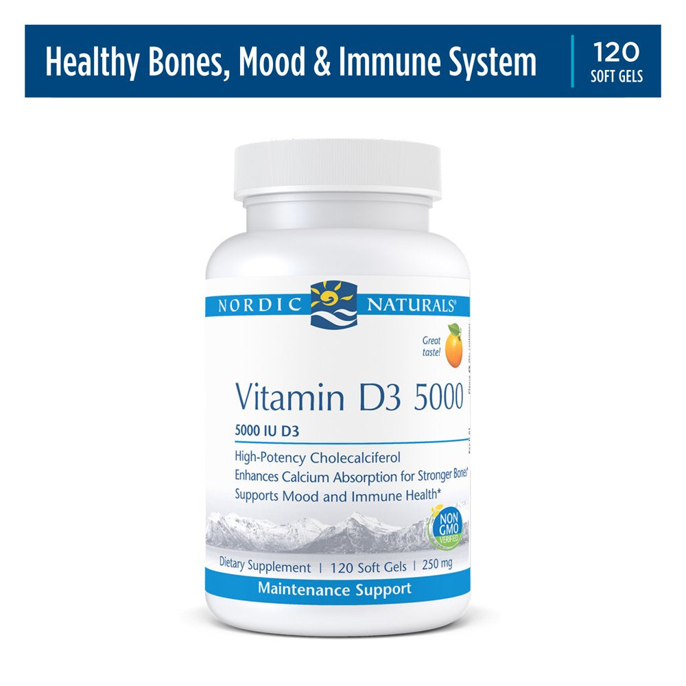 Delivering 5000 IU (125 mcg) of natural vitamin D3 (cholecalciferol) per serving, Vitamin D3 5000 is Nordic Naturals’ signature high-potency vitamin D product, and aimed to fast-track support for overall health and wellness.* Research indicates that Vitamin D plays a variety of important biological roles within the body, including regulating the absorption of calcium and phosphorous for healthy bones and teeth, supporting immune function, and regulating mood and sleep rhythms.* Although a host of environmental and biological risk factors can make it difficult for people to obtain sufficient levels of vitamin D, and provide support for bone, muscle, and immune health.*These statements have not been evaluated by the Food and Drug Administration. This product is not intended to diagnose, treat, cure or prevent any disease.