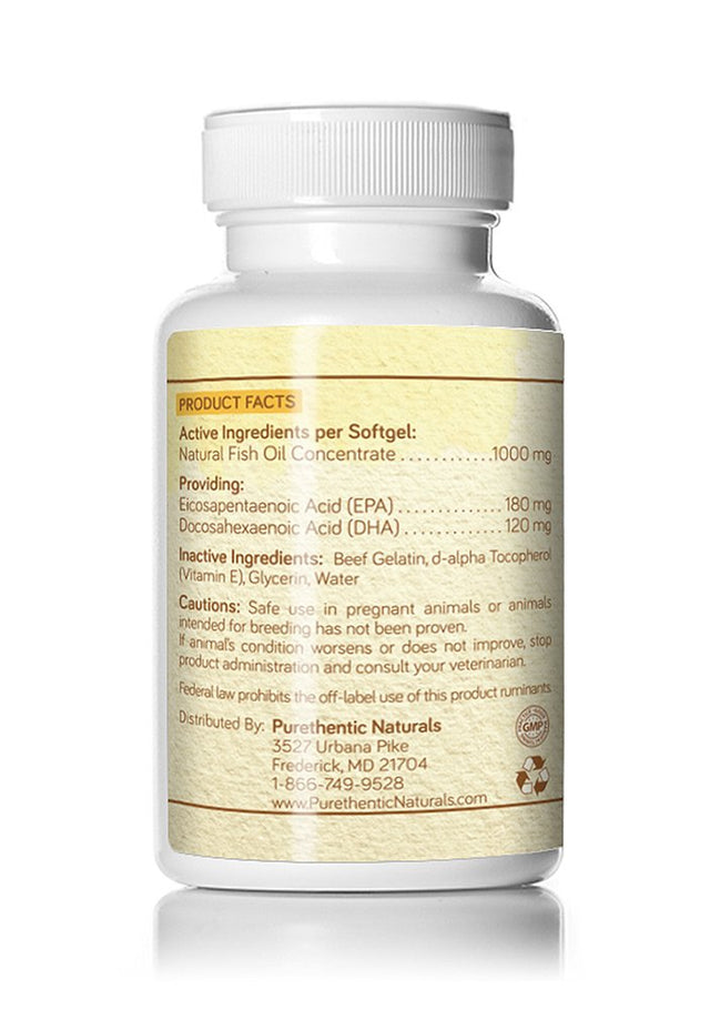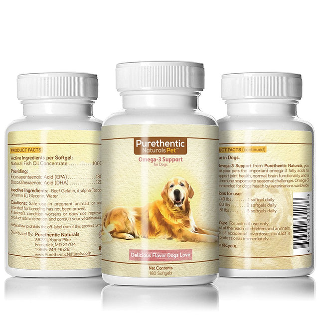 Our Omega-3 Support Dosage &; Composition is Recommended by World Renowned Veterinarians & Clinical Studies Cannot Stop Talking about the Canine Benefits of Omega 3! Joint Benefits: A leading Canadian University's Veterinary division concluded that Omega 3 Fatty Acids derived from fish oil contributed to significant improvement in the activity score of dogs. This led to natural joint-health management & combating the common arthritis issues that come with aging. Skin Health, Itchy Skin Defense, Coat’s Overall Health. Studies utilizing Omega-3 fatty acids in dogs brought improvement in coat health, pruritus, & alopecia. Omega-3's also proved more effective than flax oil for inflammatory skin disorders. Heart & Cardiovascular Benefits: Research has also shown omega-3 fatty acids improved cardiac remodeling, regulated blood pressure & enhanced healthy heart rate in canines. Cognitive Function & Neurological Health: Results suggests DHA can improve dog’s memory, agility and even learning ability. Not only that, but many dogs researched have shown improvement in pacing issues and even excessive licking. Yes, Vitamin E Included. Vitamin E balances your dog's internal chemistry once Omega 3 has been introduced into their diet. Our veterinary team’s inclusion of Vitamin E prevents lipid peroxidation of body fat to avoid adverse side effects. Be careful of other Omega 3’s in the marketplace that don't have Vitamin E included in their formula. High Quality, Value Sized, and Satisfaction Guaranteed! Remember if you or your Dog are not 100% happy with our Omega-3 let us know and we'll refund you 100%!