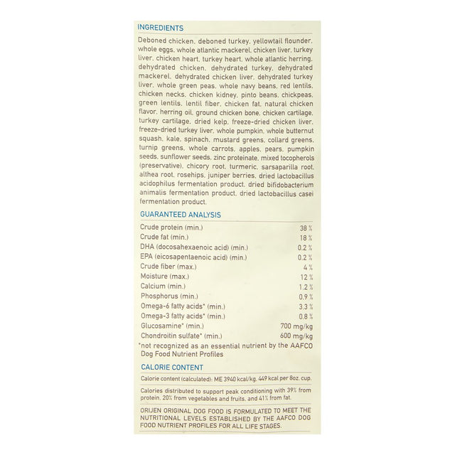 Ingredients: Deboned chicken, deboned turkey, yellowtail flounder, whole eggs, whole atlantic mackerel, chicken liver, turkey liver, chicken heart, turkey heart, whole atlantic herring, dehydrated chicken, dehydrated turkey, dehydrated mackerel, dehydrated chicken liver, dehydrated turkey liver, whole green peas, whole navy beans, red lentils, chicken necks, chicken kidney, pinto beans, chickpeas, green lentils, alfalfa, chicken fat, natural chicken flavor, herring oil, ground chicken bone, chicken cartilage, turkey cartilage, dried kelp, freeze-dried chicken liver, freeze-dried turkey liver, whole pumpkin, whole butternut squash, kale, spinach, mustard greens, collard greens, turnip greens, whole carrots, apples, pears, pumpkin seeds, sunflower seeds, zinc proteinate, mixed tocopherols (preservative), chicory root, turmeric, sarsaparilla root, althea root, rosehips, juniper berries, dried lactobacillus acidophilus fermentation product, dried bifidobacterium animalis fermentation product, dried lactobacillus casei fermentation product.
