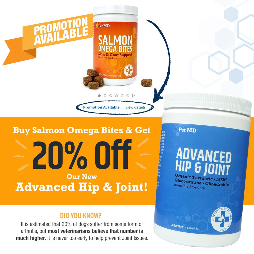 Pet MD Salmon Omega Bites Skin & Coat Support Soft Chews for Dogs are delicious soft chews for dogs over the age of 12 weeks. Provides a source of DHA and EPA, as well as Omega-3 and Omega-6 fatty acids to help support healthy skin and a glossy coat. Use daily for optimal results. Omega fatty acids have anti inflammatory properties that help curb itching, scratching, and biting due to dry flaky skin, allergies, and other skin conditions. A superior and delicious source of fish oil for dogs for a shiny coat and healthy skin. omega 3's with EPA & DHA also support immune, joint, brain, & bone health. Omega fatty acids are essential and dogs can't produce these vital nutrients. A quality Omega 3 supplement helps bridge the gap left by commercial dog foods.