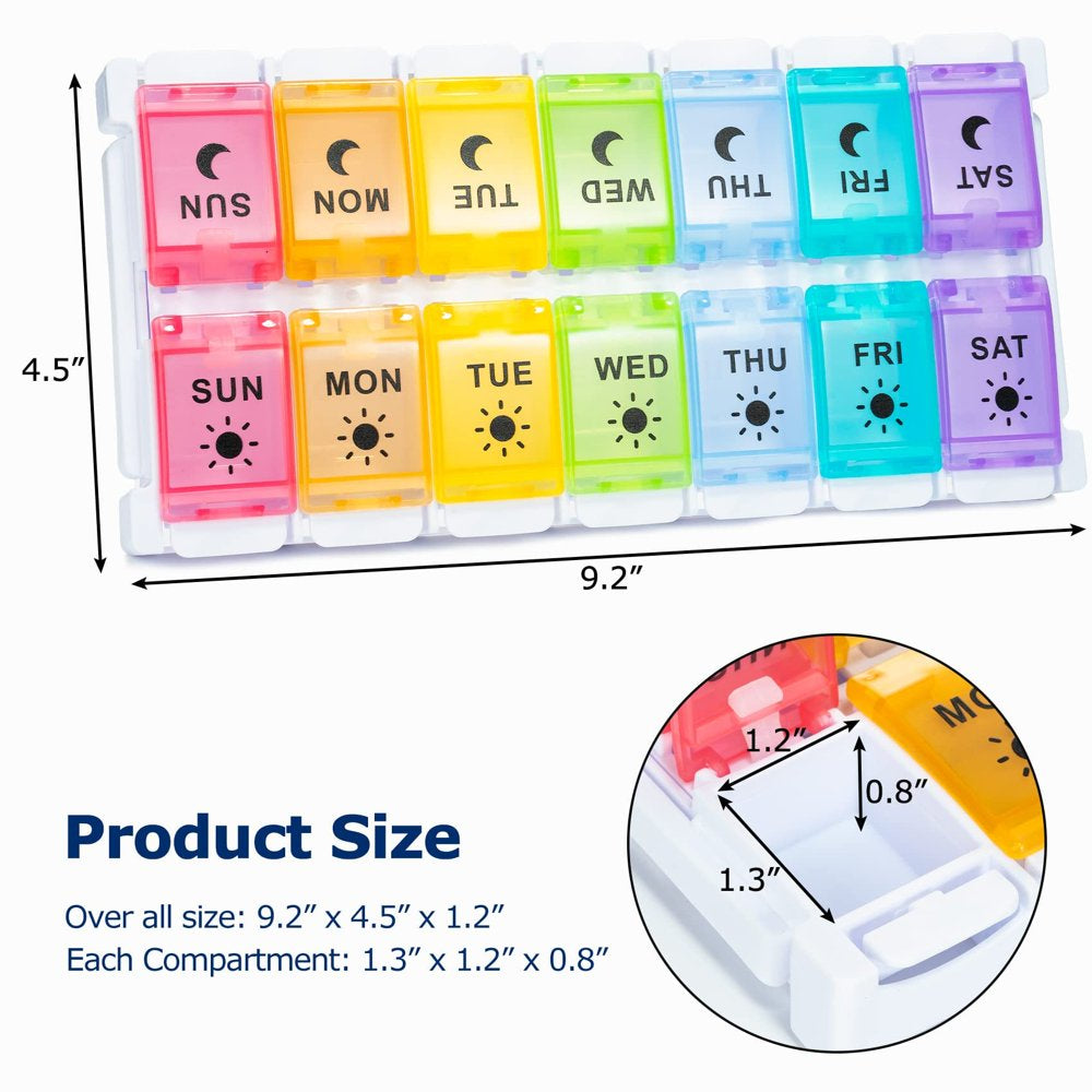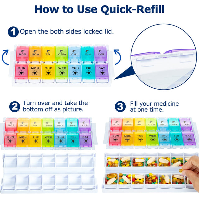 • 【Easy Open & Quick Fill】It can be a pain remembering to refill your pill box,this morning night pill organizer helps you save 50% time by organizing a week's worth of pills at one time.simply open the double side buckles and remove the detachable base, then fill it with all the correct supplements, vitamins, or pain relief for an entire week.in just minutes you'll have an entire week of medication organized and ready to go!