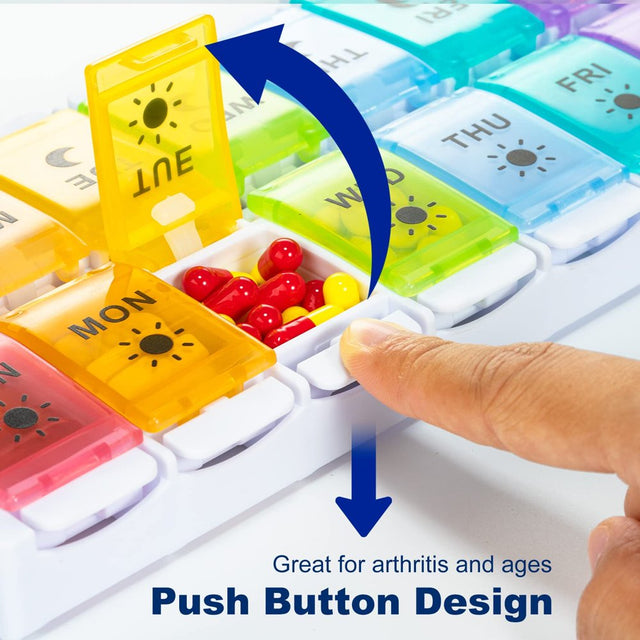 • 【Push Button Xl Pill Organizer】Push button design with a simple push-and-squeeze operation to open and close, making it perfect for those with weak finger strength, arthritis, poor dexterity or old age.the specially designed snap-shut lips will ensure that your pills are secure and not spill out of the container even when the container is tipped upside down.