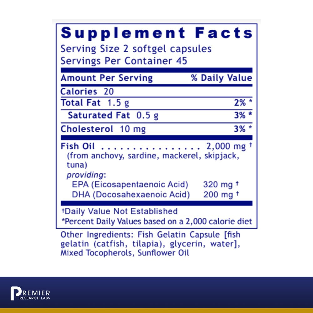 Premier Research EPA/DHA Marine softgels contain natural docosahexaenoic acid (DHA) and eicosapentaenoic acid (EPA) from the original fish oil without molecular distillation. The fish oil is naturally purified using a cold filtration process that does not require heavy manipulation, high heat processing or the use of harsh solvents to separate the EPA and DHA. Cold filtered, clay purified, deep-sea fish oil softgels with healthy triglycerides support healthy brain joints and cardiovascular function. The fish oil is purified fish oil that is naturally refined to remove contaminants and saturated fatty acids to leave only healthy triglycerides as omega-3 poly-unsaturated fatty acids in the form of DHA and EPA. It is naturally preserved from oxidation using mixed tocopherol and other appropriate antioxidants. Take 2 softgels daily or as directed by a health professional.