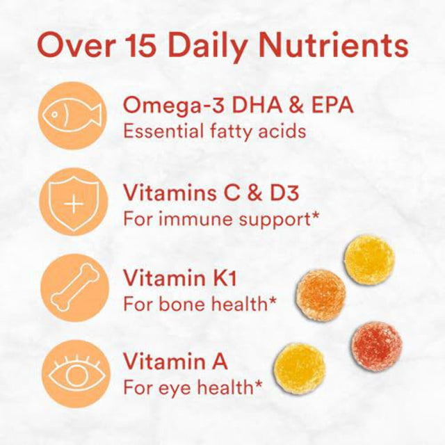 - With Over 15 Nutrients to Support Growing Bodies: Our science-backed formula includes vitamins B12, A, E, K1 and iodine, as well as Omega-3 EPA & DHA, meaning you get more benefits from our kids chewable multivitamins in each serving