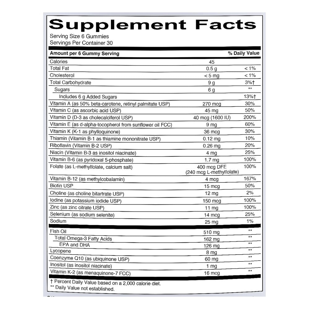 SmartyPants Men's Multi & Omegas gummies are made with over 15 premium nutrients including omega-3 EPA and DHA essential fatty acids, CoQ10 for heart health, vitamin B12 to support energy metabolism, vitamin D3 for immune health, lycopene for prostate health and folate as methylfolate, all in one delicious gummy serving.*