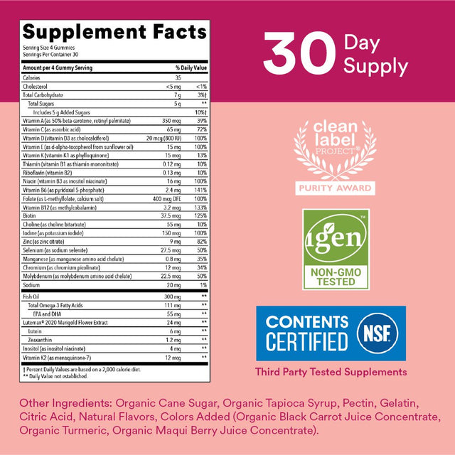 SmartyPants Teen Girl Multi & Omegas gummies are made with over 15 premium nutrients including omega-3 EPA and DHA essential fatty acids, lutein & zeaxanthin for eye health, vitamin K for bone health, vitamin D3 for immune health and vitamin B12 as methylcobalamin to support energy metabolism, all in one delicious gummy serving.