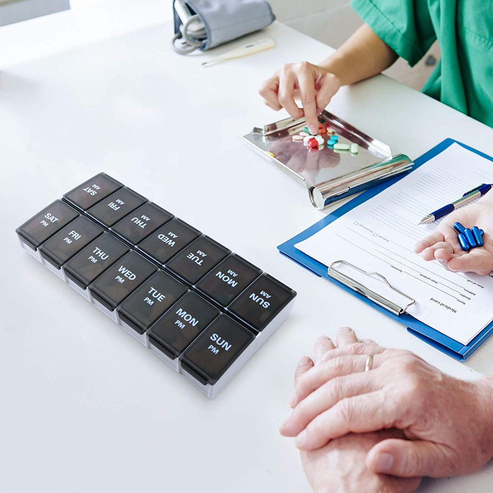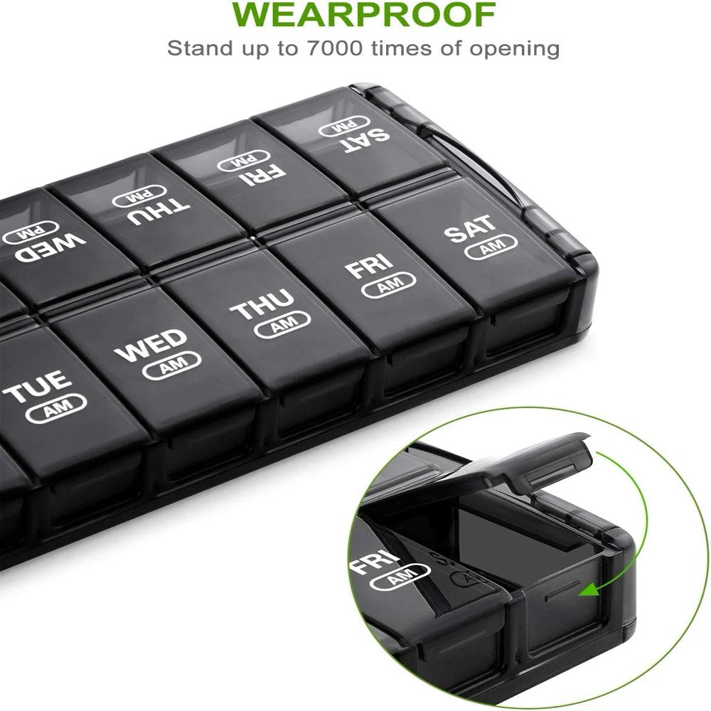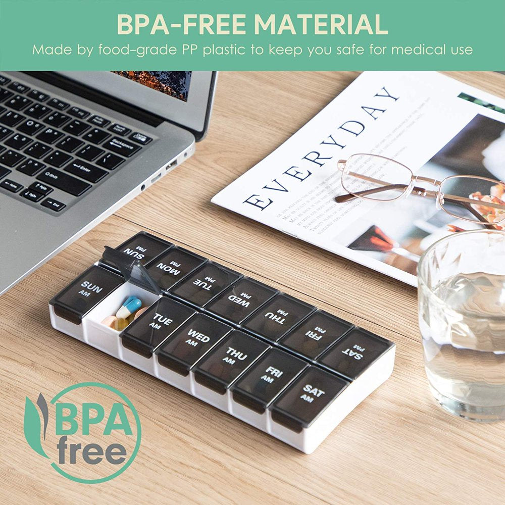 Sukuos 7 Day Weekly Pill Organizer with 2 Times a Day Compartment - AM PM, Pill Holder, Daily Pill Box Planner for Pills, Vitamins, Fish Oil, Supplements, Extra Large with Moisture Proof, Black