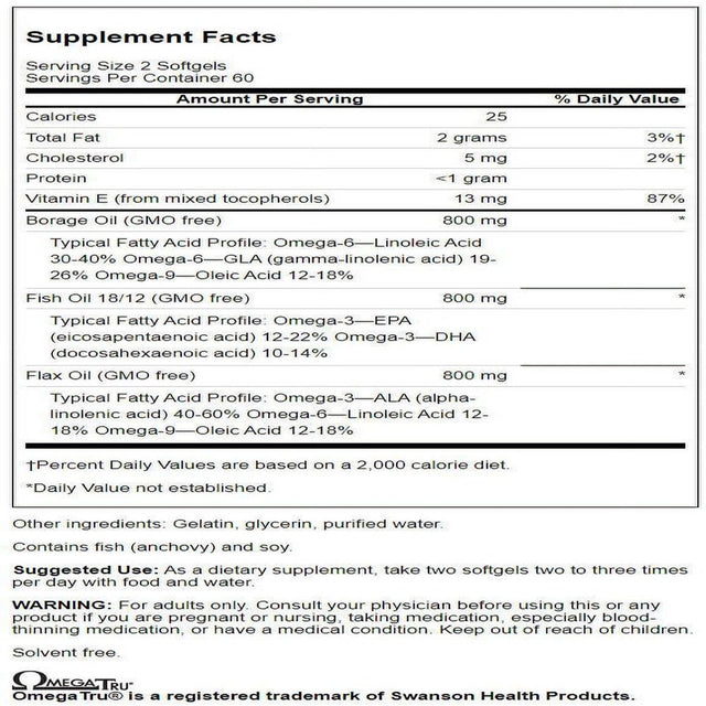- NATURE'S BEST OILS: Swanson's Multiomega 3-6-9 include nature's best oils from land and sea! Featuring a combination of Flax, Borage, and Fish Oils, our non-GMO capsules provide a balanced blend of essential fatty acids.