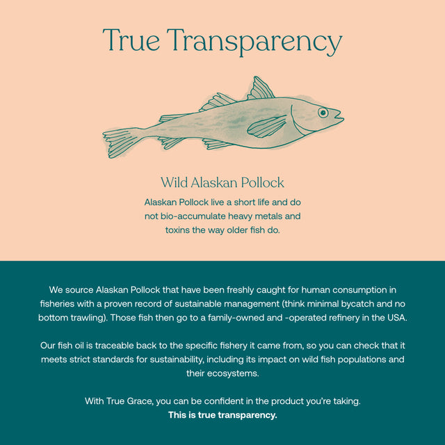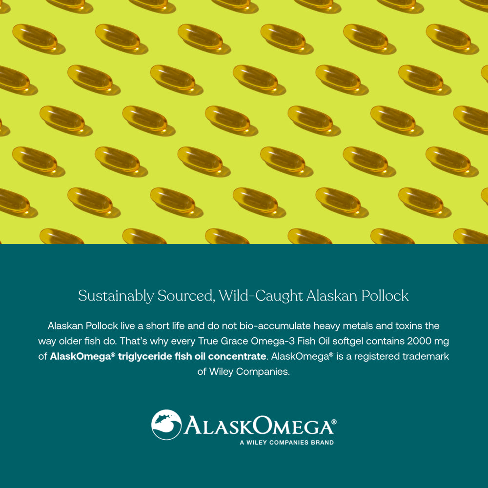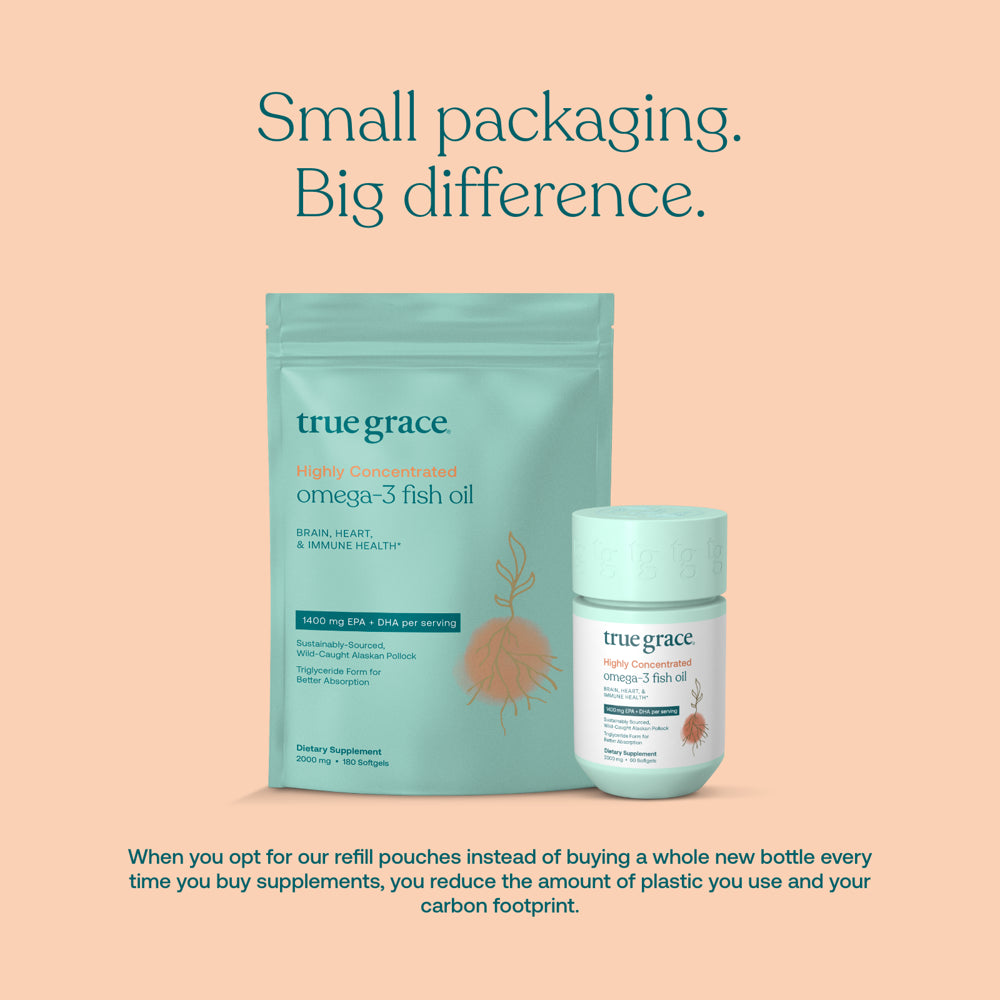 TARGETED NUTRIENTS FOR WHOLE BODY WELLNESS - For those who expect more from their supplements. Crafted with intention, our sh oil is carefully sourced and selected providing high potency, optimal absorption, and utilization of the key nutrients EPA and DHA. Provides 1400 mg of these essential fatty acids in triglyceride form to support healthy blood lipid levels already within normal range, normal brain function, a healthy immune response and may help support joint health.,TRUE TRANSPARENCY - We source our sh oil from Alaskan Pollock that have been freshly caught for human consumption in sheries with a proven record of sustainable management. Those sh then go to a family-owned and operated re nery in the USA. Our sh oil is traceable back to the speci c shery it came from, so you can be assured that it meets strict standards for sustainability, including its impact on wild sh populations and their ecosystems.,BETTER ABSORPTION - Our sh oil contains omega-3s in their triglyceride form which is more bioavailable for optimal absorption. Studies support that the use of the triglyceride form leads to a greater increase of your omega-3 (the levels of omega-3s in your blood) than forms like ethyl esters do.,REUSABLE, RECYCLED PACKAGING - Our commitment to planetary health is real right down to the recycled packaging we use. Plus, every time you purchase a bottle or pouch of True Grace products, plastic is pulled out of the ocean. Our supplements are delivered in custom-made, reusable bottles made from recycled plastics we offer refill pouches of your favorite True Grace products made of carbon-neutral packaging from sustainably sourced sugarcane.,GOOD FOR YOU AND THE EARTH AROUND YOU - True Grace is rooted in the knowledge that comes with experience. With nearly 70 years of experience leading some of the top mission-driven companies in the natural products industry. We re regenerating nutrition from the ground up through nutrient-dense supplements that strive to improve the health of body and planet. We are certified Carbon Neutral, hitting net zero greenhouse gas emissions for our company operations.