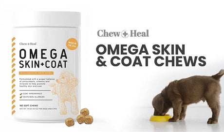 Chew + Heal Omega Skin and Coat Supplement - 180 Soft Chews - Salmon Fish Oil for Dogs and Cats