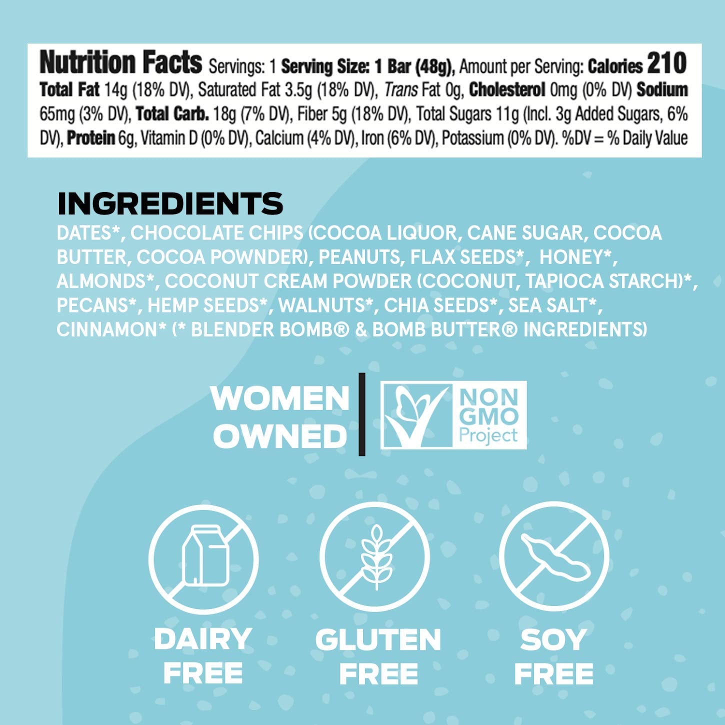 - ALL YOUR SUPERFOODS IN ONE BAR: Bomb Bars are the best way to introduce everyone to a plant-based lifestyle. Each bar is loaded with Dates, Vegan Chocolate Chips (Cane Sugar, Cocoa Liquor, Cocoa Butter), Peanut Butter, Almonds, Flaxseeds, Honey, Peanuts, Walnuts, Coconut Milk Powder (Coconut, Tapioca Starch, Acacia Fiber), Aloe Vera, Pecans, Hemp Seeds, Chia Seeds, Dried Vinegar, Sea Salt, Cinnamon.