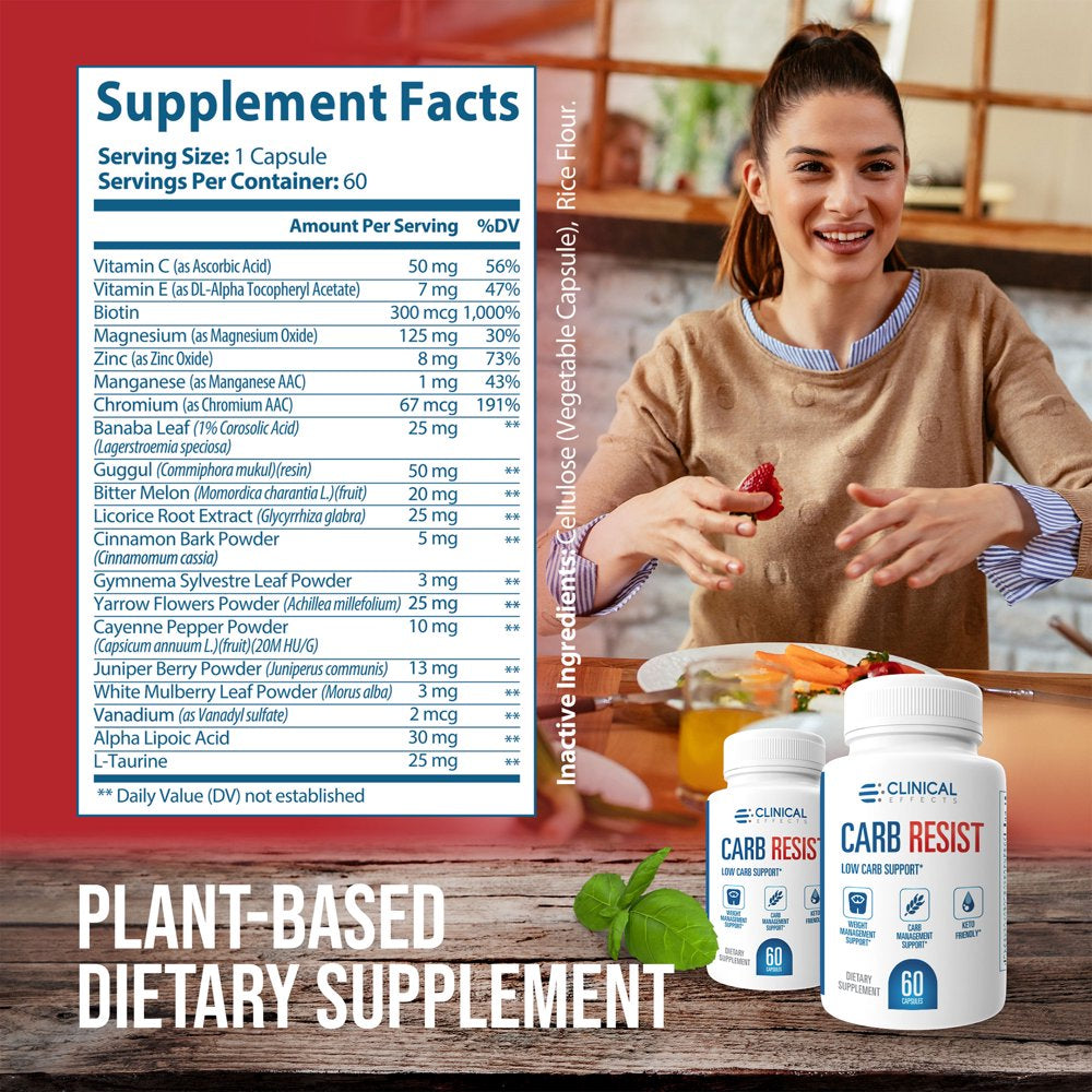 Clinical Effects Carb Resist - Carb Blocker with Vitamin C - 60 Capsules - Ideal for Keto or Low Carb Lifestyle - Supports Heart Health and Weight Management - Plant-Based is backordered and will ship as soon as it is back in stock.