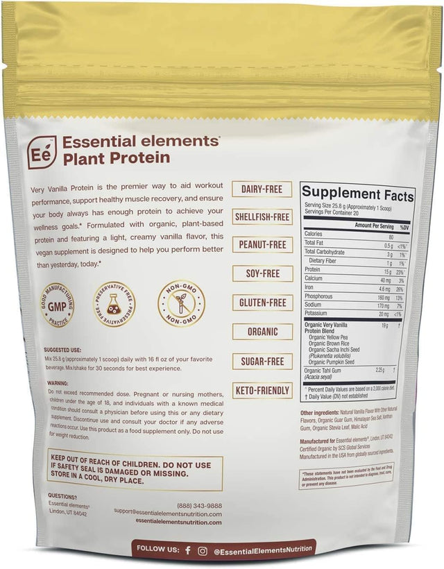 Essential Elements Organic Pea Protein Powder - Very Vanilla | Low-Carb Plant-Based Vegan Blend - Keto-Friendly and Gluten-Free | 20 Servings, 18.2 Oz